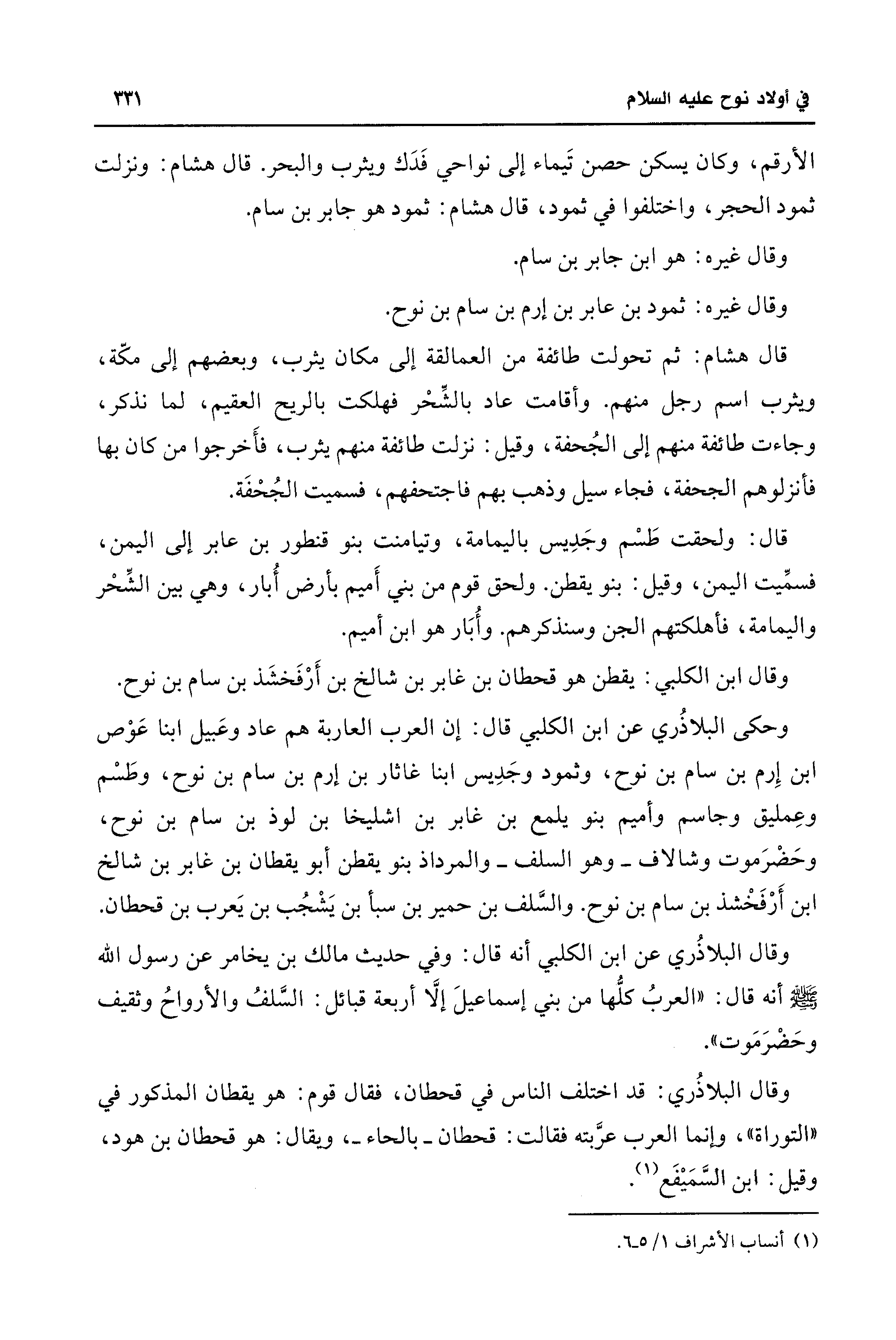 وحكى البلاذُري عن ابن الكلبي قال: إن العرب العاربة هم عاد وعَبيل ابنا عَوْص بن إِرم بن سام بن نوح، وثمود وجَدِيس ابنا غاثار بن إرم بن سام بن نوح، وطَسْم وعِمليق وجاسم وأميم بنو يلمع بن غابر بن اشليخا بن لوذ بن سام بن نوح، وحَضْرَموت وشالاف -وهو السلف- والمرداذ بنو يقطن أبو يقطان بن غابر بن شالخ بن أَرْفَخْشذ بن سام بن نوح. والسَّلف بن حمير بن سبأ بن يَشْجُب بن يَعرب بن قحطان.