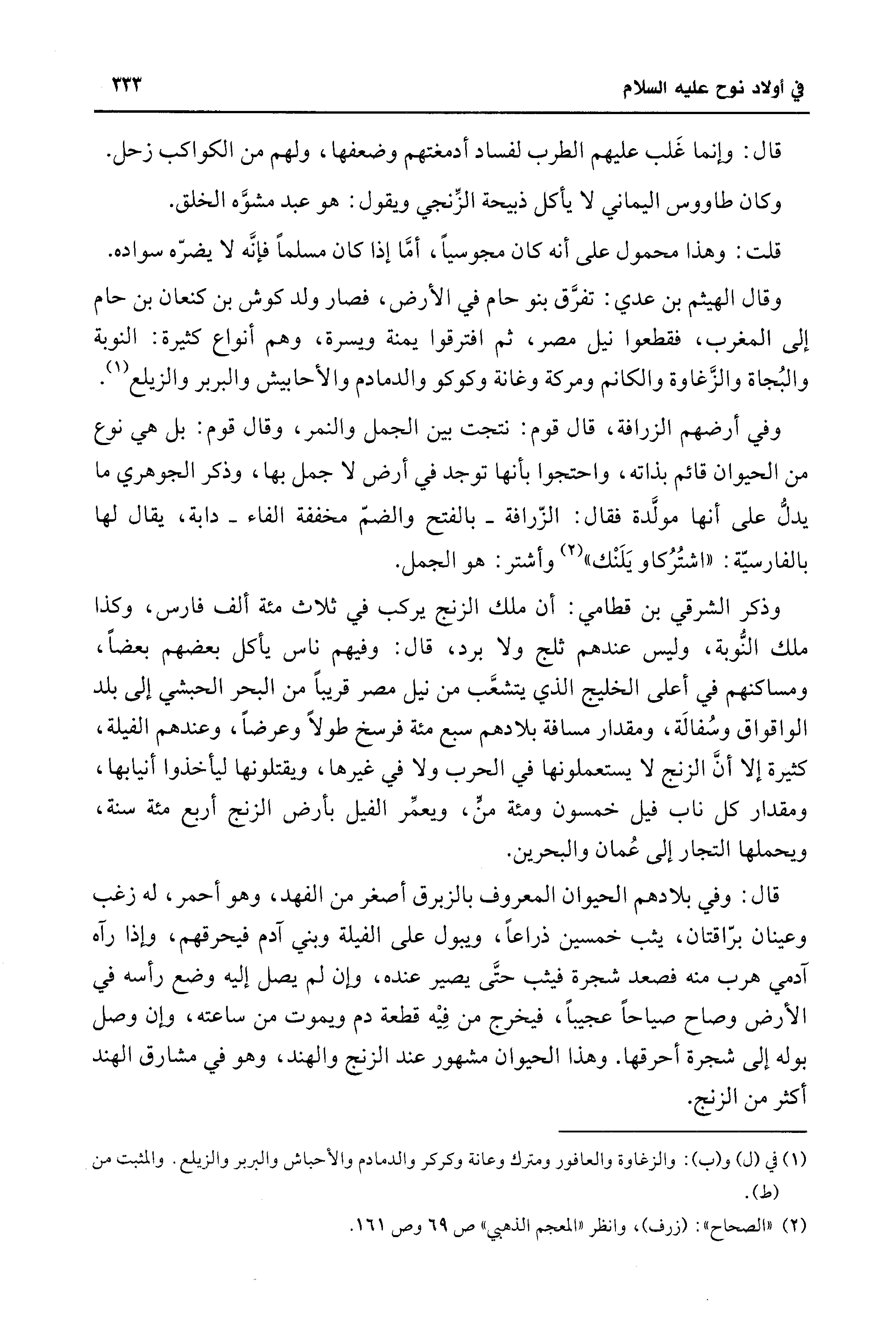 وفي أرضهم الزرافة، قال قوم: نتجت بين الجمل والنمر، وقال قوم: بل هي نوع من الحيوان قائم بذاته، واحتجوا بأنها توجد في أرض لا جمل بها، وذكر الجوهري ما يدلُّ على أنها مولَّدة فقال: الزّرافة -بالفتح والضمّ مخففة الفاء- دابة، يقال لها بالفارسيّة: "اشتُرُكاو يَلَنْك" (¬2) وأشتر: هو الجمل.