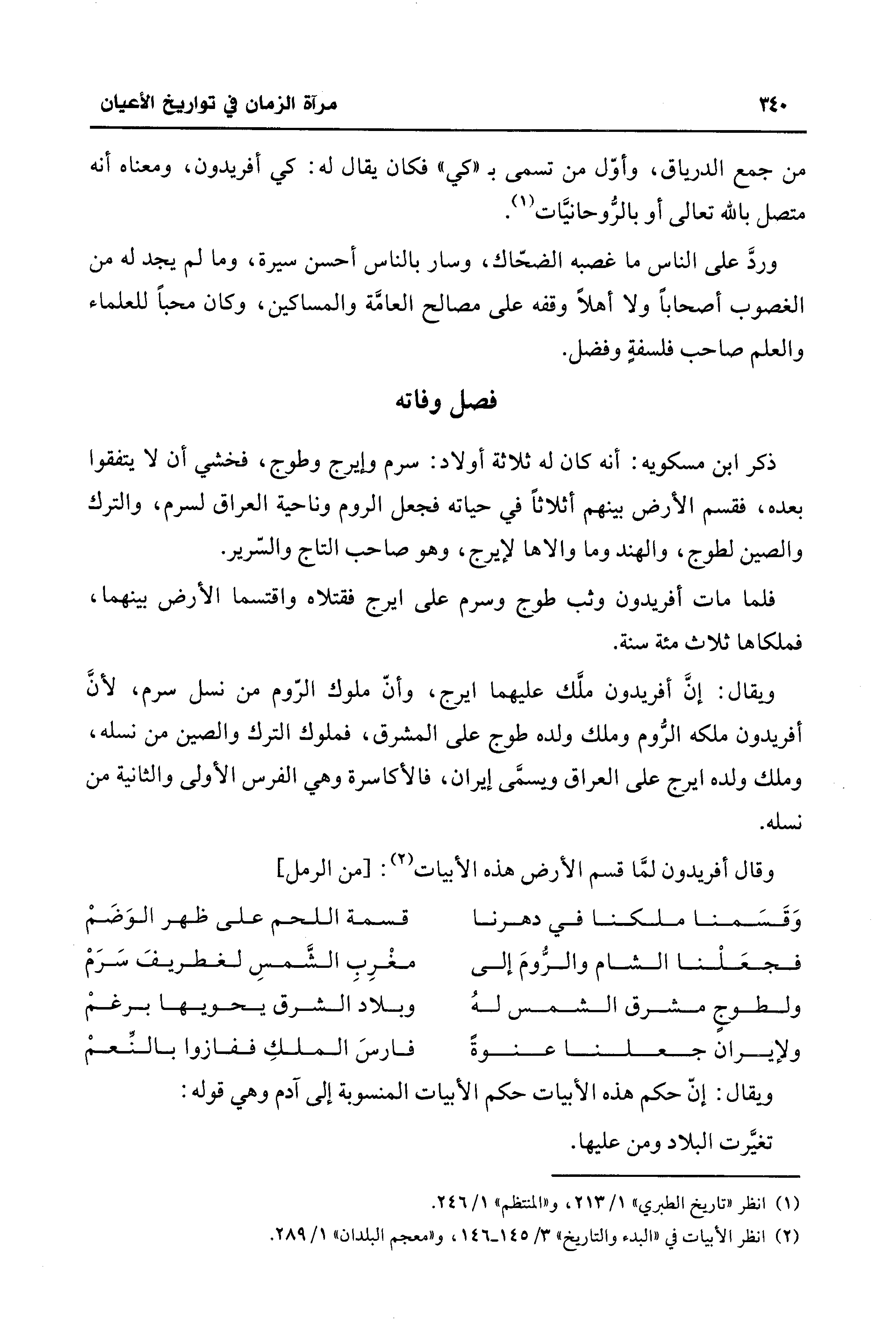 ويقال: إنَّ أفريدون ملَّك عليهما ايرج، وأنّ ملوك الرّوم من نسل سرم، لأنَّ أفريدون ملكه الرُّوم وملك ولده طوج على المشرق، فملوك الترك والصين من نسله، وملك ولده ايرج على العراق ويسمَّى إيران، فالأكاسرة وهي الفرس الأولى والثانية من نسله.