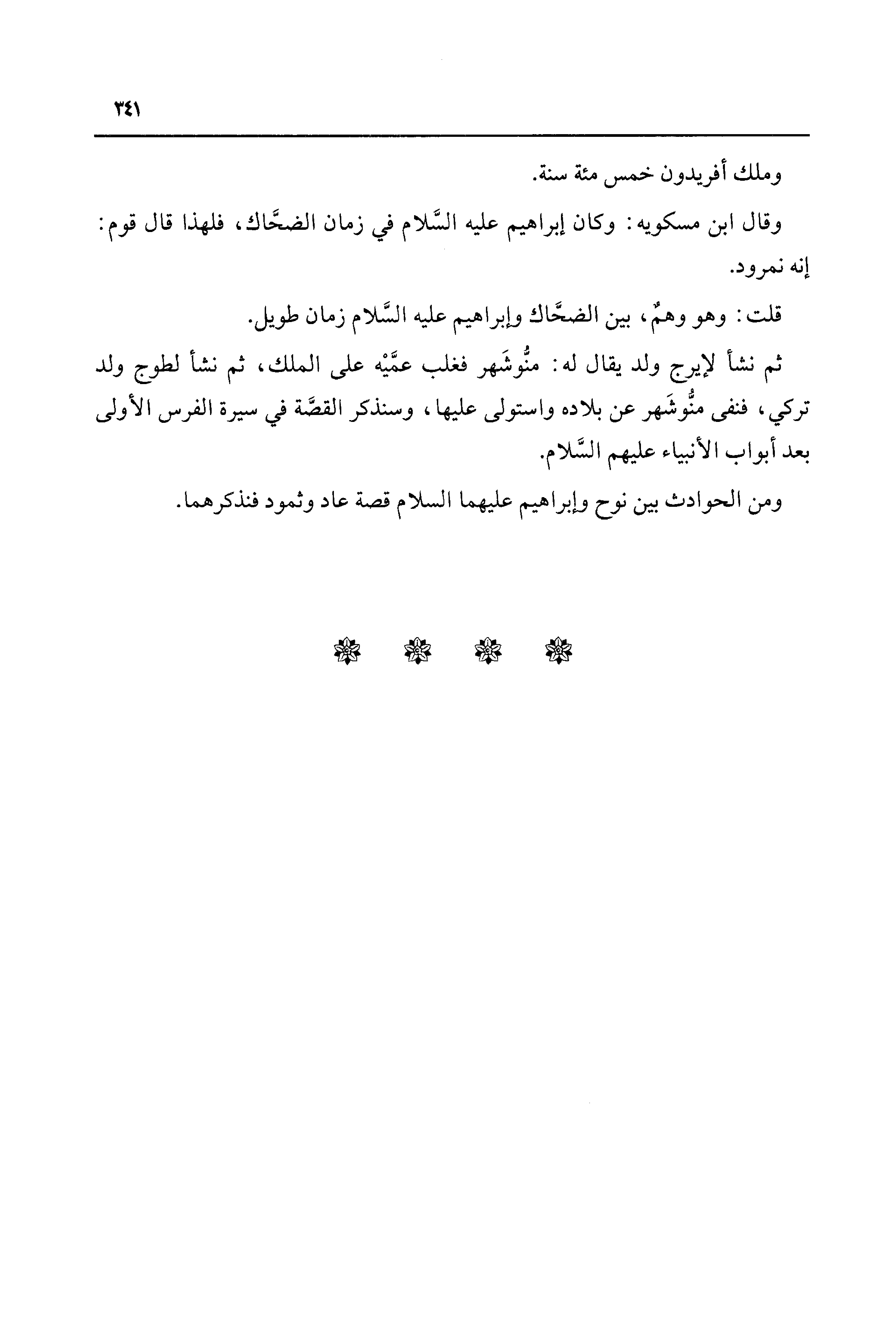 ثم نشأ لإيرج ولد يقال له: منُّوشَهر فغلب عمَّيْه على الملك، ثم نشأ لطوج ولد تركي، فنفى منُّوشَهر عن بلاده واستولى عليها، وسنذكر القصَّة في سيرة الفرس الأولى بعد أبواب الأنبياء عليهم السَّلام.