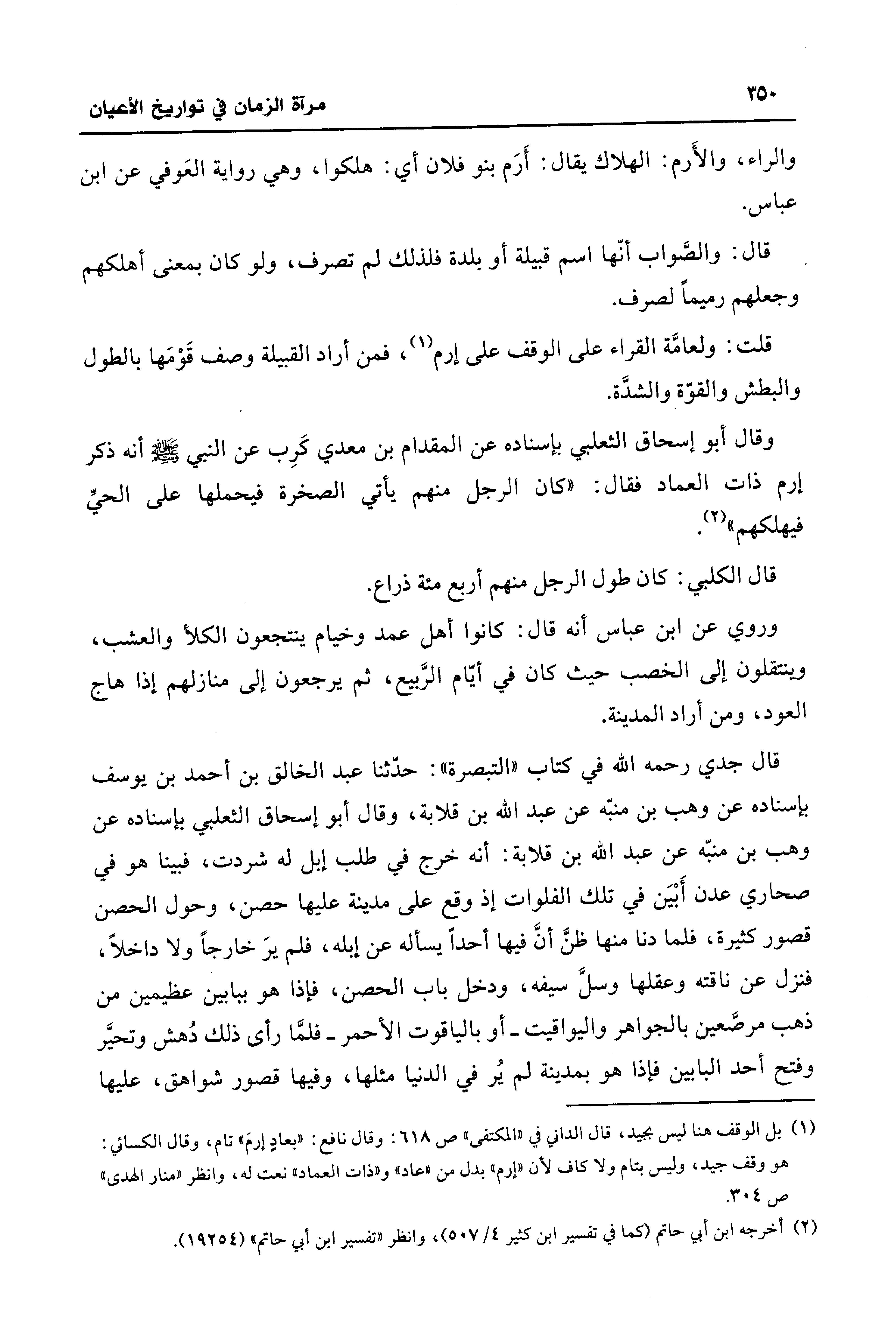 قال جدي رحمه الله في كتاب "التبصرة": حدَّثنا عبد الخالق بن أحمد بن يوسف بإسناده عن وهب بن منبّه عن عبد الله بن قلابة، وقال أبو إسحاق الثعلبي بإسناده عن وهب بن منبّه عن عبد الله بن قلابة: أنه خرج في طلب إبل له شردت، فبينا هو في صحاري عدن أَبْيَن في تلك الفلوات إذ وقع على مدينة عليها حصن، وحول الحصين قصور كثيرة، فلما دنا منها ظنَّ أنَّ فيها أحدًا يسأله عن إبله، فلم يرَ خارجًا ولا داخلًا، فنزل عن ناقته وعقلها وسلَّ سيفه، ودخل باب الحصن، فإذا هو ببابين عظيمين من ذهب مرصَّعين بالجواهر واليواقيت -أو بالياقوت الأحمر- فلمَّا رأى ذلك دُهش وتحيَّر وفتح أحد البابين فإذا هو بمدينة لم يُر في الدنيا مثلها، وفيها قصور شواهق، عليها