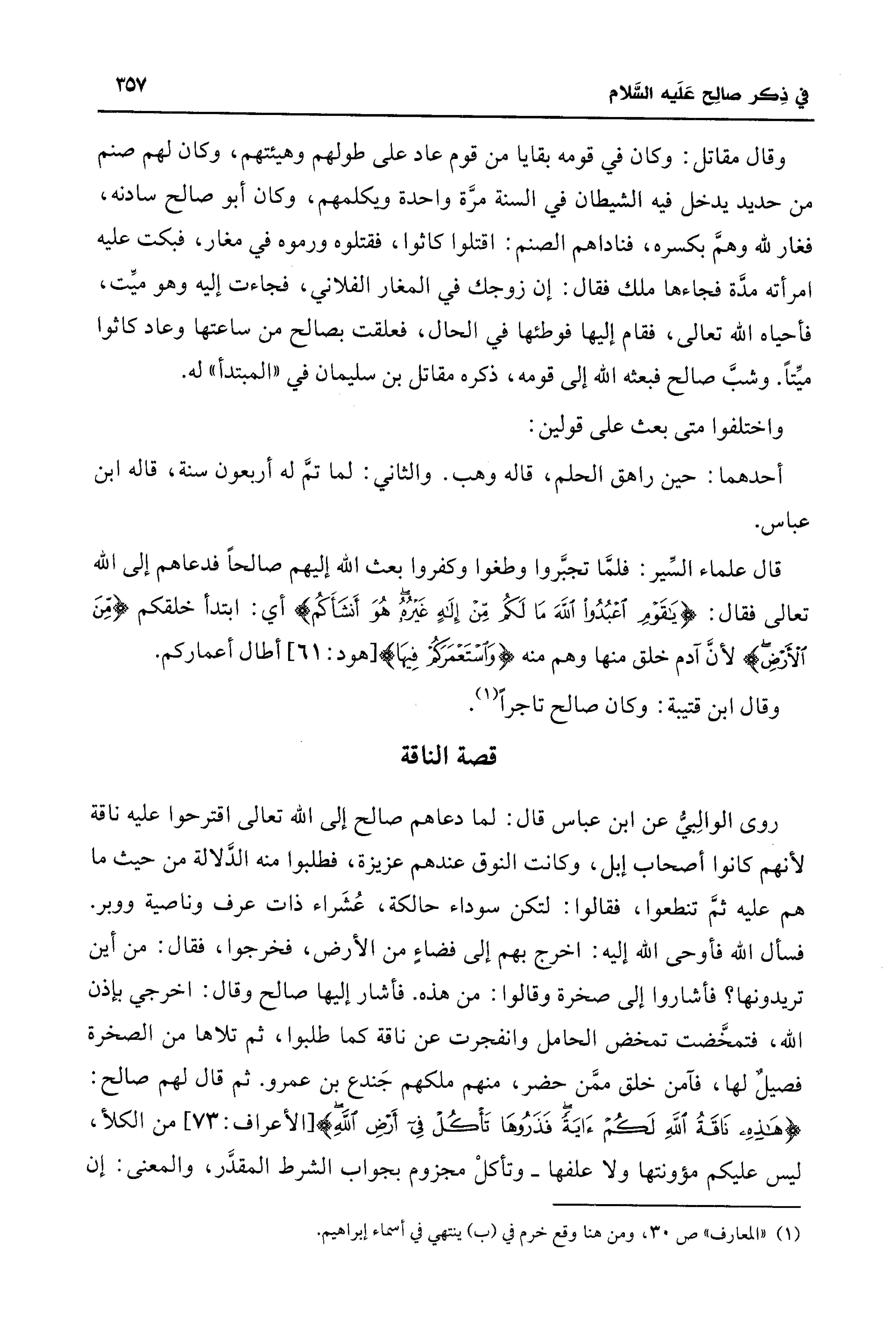 وقال مقاتل: وكان في قومه بقايا من قوم عاد على طولهم وهيئتهم، وكان لهم صنم من حديد يدخل فيه الشيطان في السنة مرَّة واحدة ويكلمهم، وكان أبو صالح سادنه، فغار لله وهمَّ بكسره، فناداهم الصنم: اقتلوا كانوا، فقتلوه ورموه في مغار، فبكت عليه امرأته مدَّة فجاءها ملك فقال: إن زوجك في المغار الفلاني، فجاءت إليه وهو ميت، فأحياه الله تعالى، فقام إليها فوطئها في الحال، فعلقت بصالح من ساعتها وعاد كاثوا ميِّتًا. وشبَّ صالح فبعثه الله إلى قومه، ذكره مقاتل بن سليمان في "المبتدأ" له.