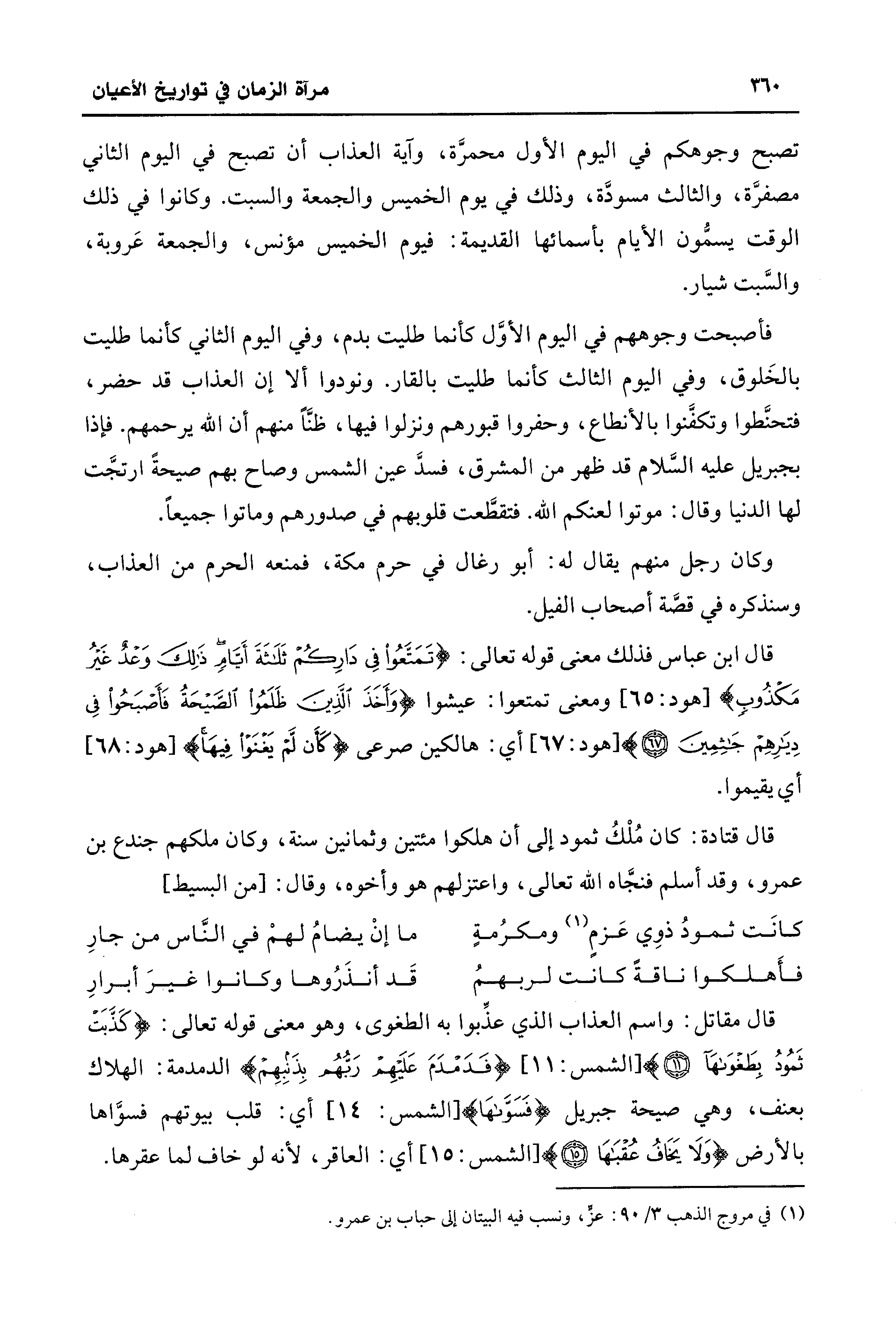 تصبح وجوهكم في اليوم الأول محمرَّة، وآية العذاب أن تصبح في اليوم الثاني مصفرَّة، والثالث مسودَّة، وذلك في يوم الخميس والجمعة والسبت. وكانوا في ذلك الوقت يسمُّون الأيام بأسمائها القديمة: فيوم الخميس مؤنس، والجمعة عَروبة، والسَّبت شيار.