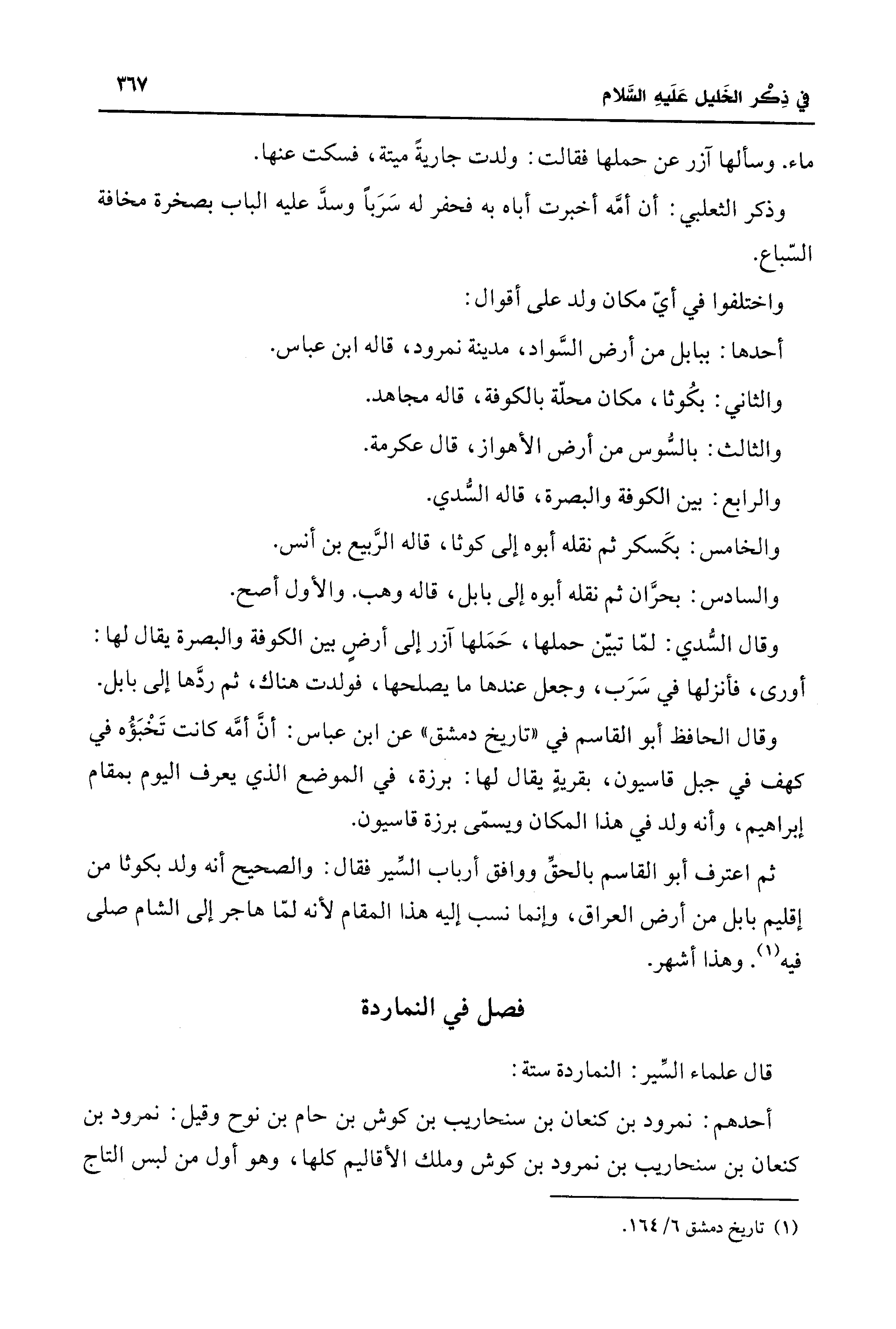 ثم اعترف أبو القاسم بالحقِّ ووافق أرباب السّير فقال: والصحيح أنه ولد بكوثا من إقليم بابل من أرض العواق، وإنما نسب إليه هذا المقام لأنه لمّا هاجر إلى الشام صلى فيه (¬1). وهذا أشهر.