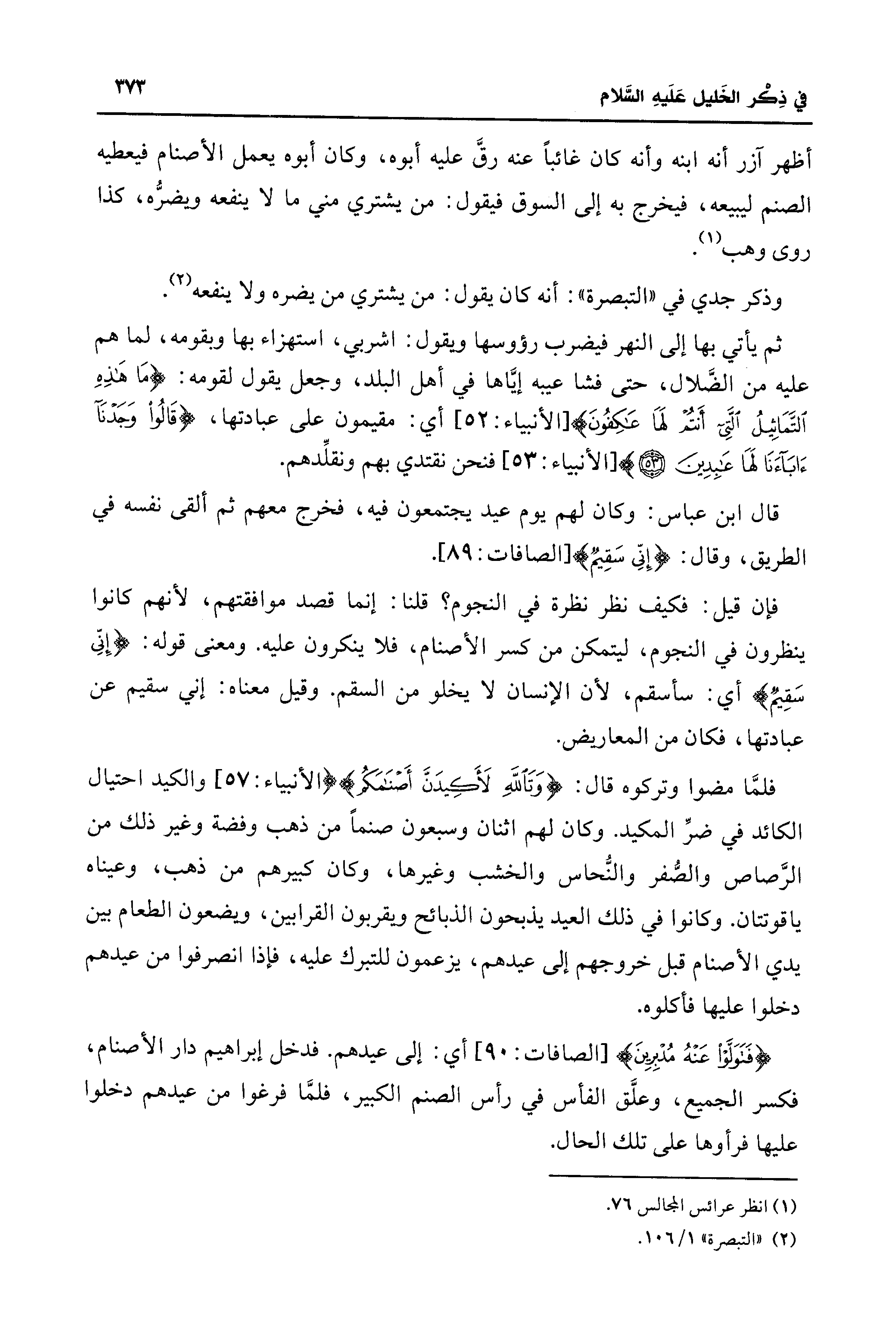 فلمَّا مضوا وتركوه قال: {وَتَاللَّهِ لَأَكِيدَنَّ أَصْنَامَكُمْ} [الأنبياء: 57] والكيد احتيال الكائد في ضرِّ المكيد. وكان لهم اثنان وسبعون صنمًا من ذهب وفضة وغير ذلك من الرَّصاص والصُّفر والنُّحاس والخشب وغيرها، وكان كبيرهم من ذهب، وعيناه ياقوتتان. وكانوا في ذلك العيد يذبحون الذبائح ويقربون القرابين، ويضعون الطعام بين يدي الأصنام قبل خروجهم إلى عيدهم، يزعمون للتبرك عليه، فإذا انصرفوا من عيدهم دخلوا عليها فأكلوه.