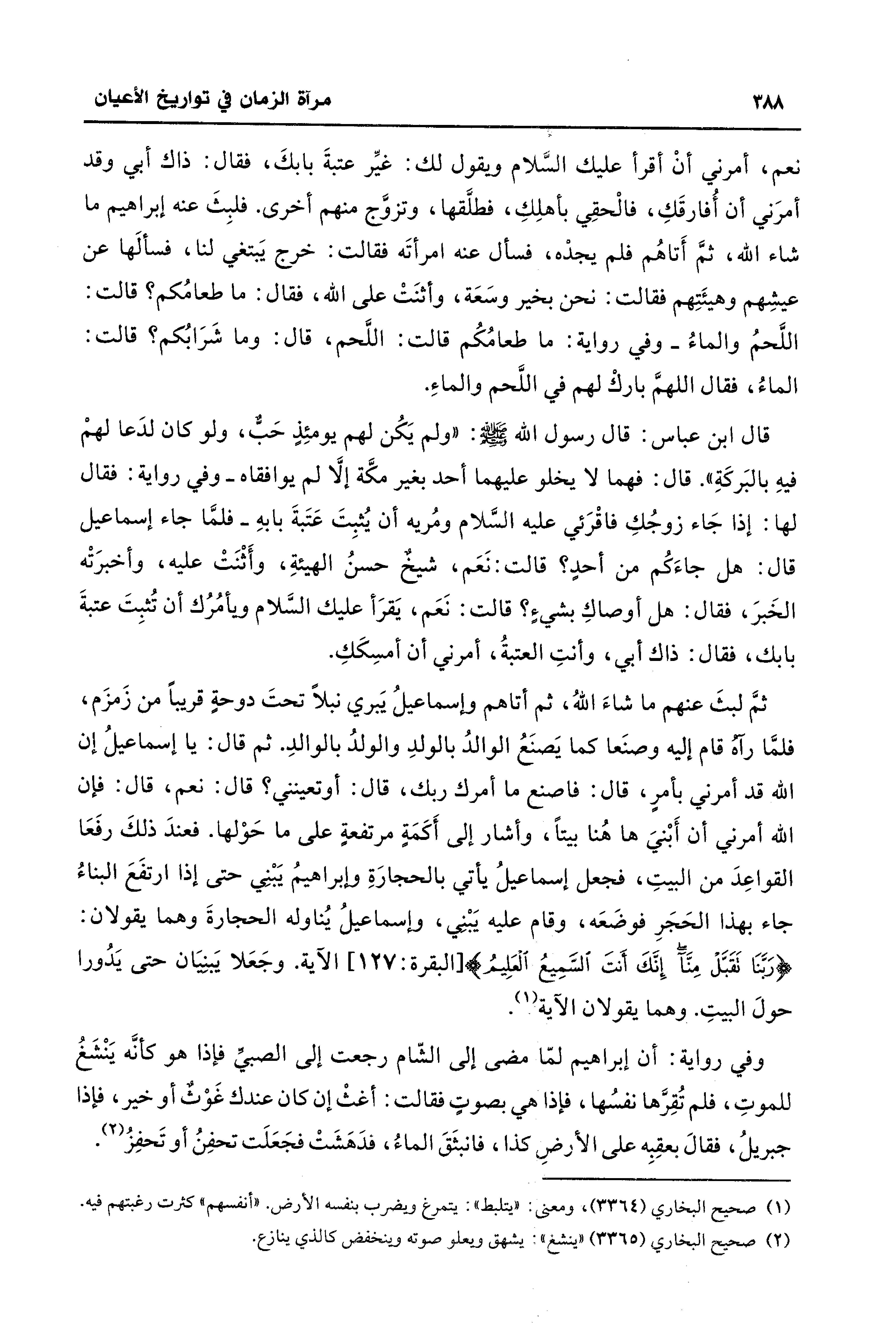 قال ابن عباس: قال رسول الله - صلى الله عليه وسلم -: "ولم يَكُن لهم يومئِذٍ حَبٌّ، ولو كان لدَعا لهمْ فيهِ بالبَركَةِ". قال: فهما لا يخلو عليهما أحد بغير مكَّة إلا لم يوافقاه -وفي رواية: فقال لها: إذا جَاء زوجُكِ فاقْرَئي عليه السَّلام ومُريه أن يُثبِتَ عَتَبةَ بابهِ- فلمَّا جاء إسماعيل قال: هل جاءَكُم من أحدٍ؟ قالت: نَعَم، شيخٌ حسنُ الهيئةِ، وأَثْنَتْ عليه، وأخبرَتْه الخَبرَ، فقال: هل أوصاكِ بشيءٍ؟ قالت: نَعَم، يَقرَأ عليك السلام ويأمُرُك أن تُثبِتَ عتبةَ بابك، فقال: ذاك أبي، وأنتِ العتبةُ، أمرني أن أمسِكَكِ.