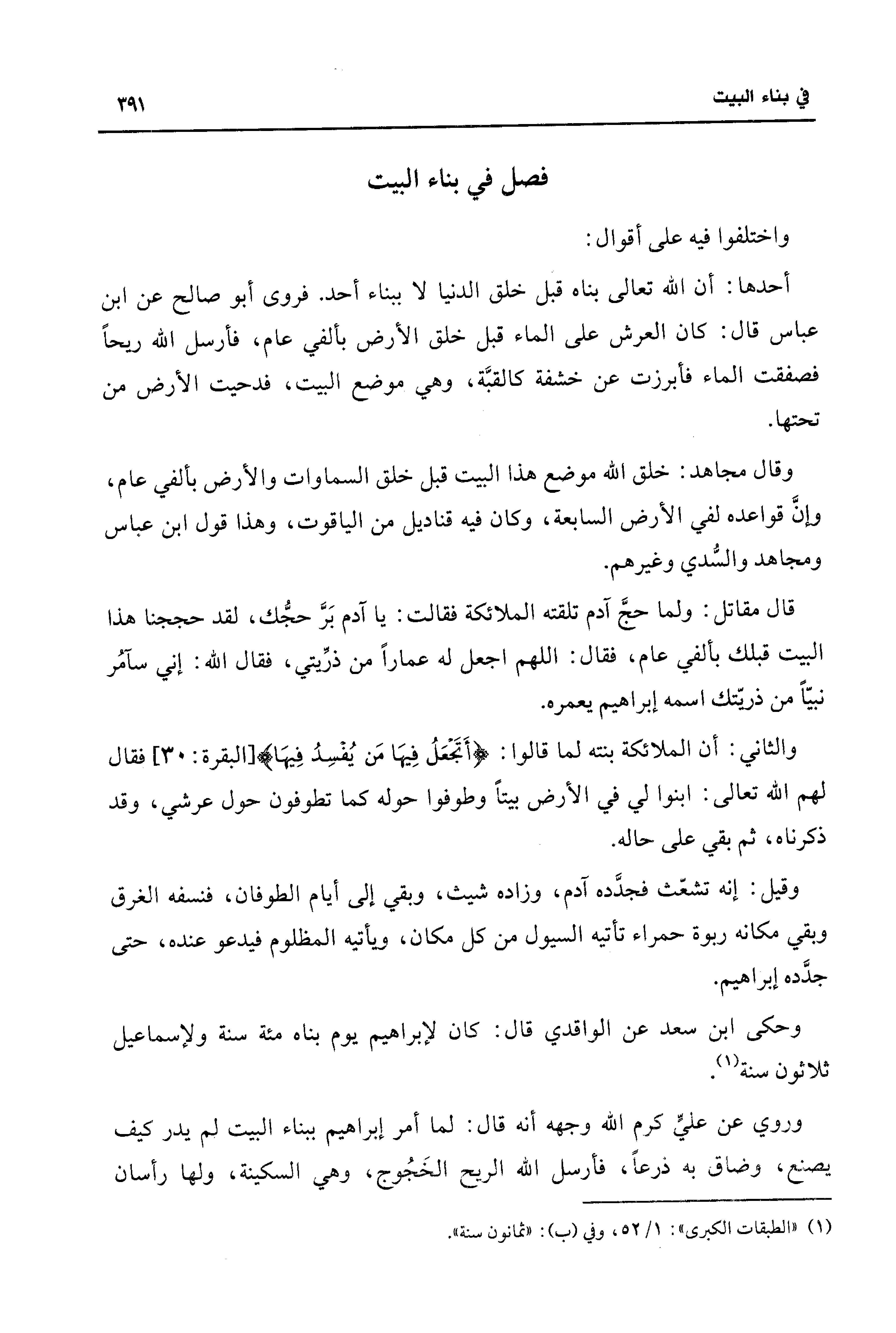 قال مقاتل: ولما حجَّ آدم تلقته الملائكة فقالت: يا آدم بَرَّ حجُّك، لقد حججنا هذا البيت قبلك بألفي عام، فقال: اللهم اجعل له عمارًا من ذرِّيتي، فقال الله: إني سآمُر نبيًّا من ذريّتك اسمه إبراهيم يعمره.