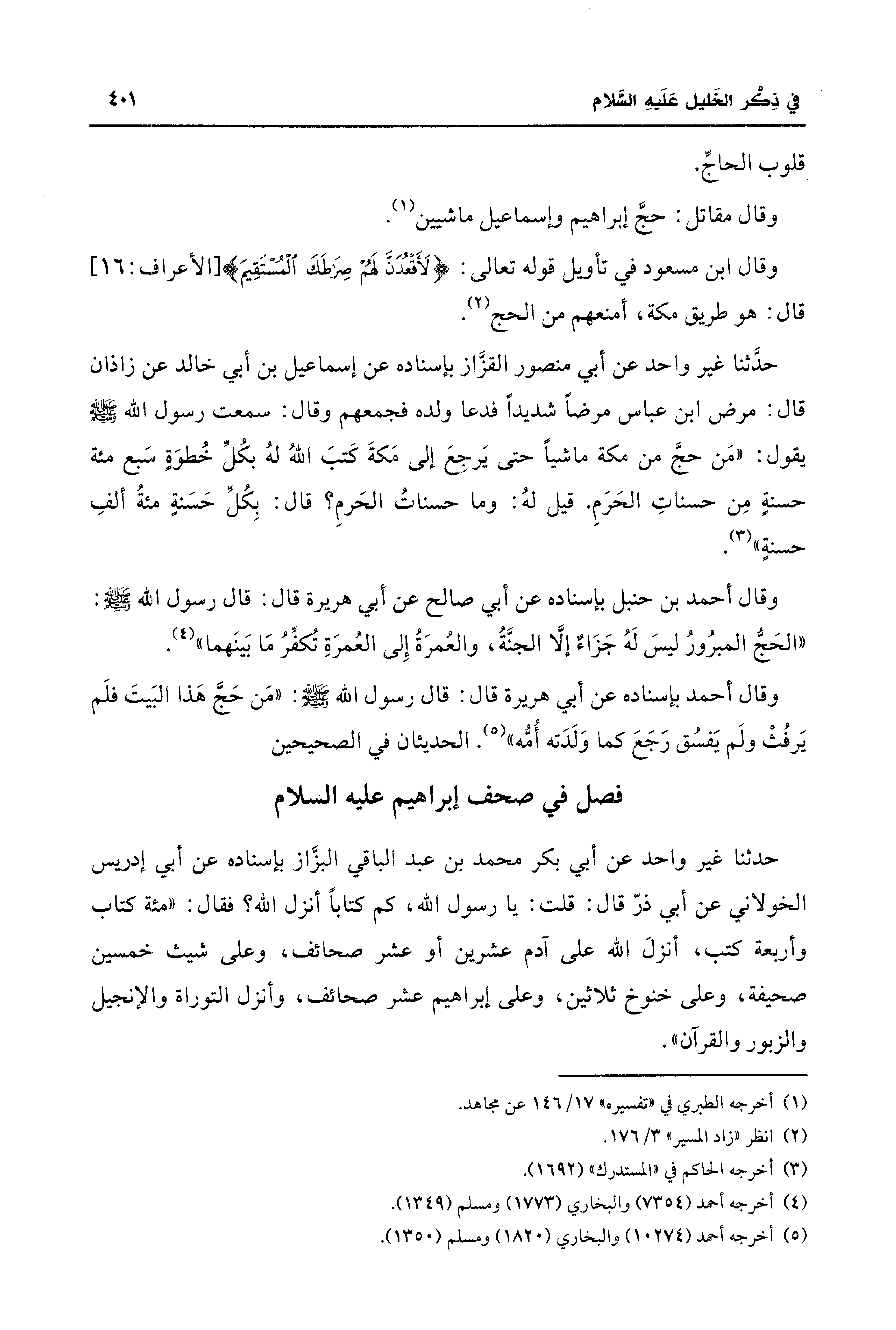 حدثنا غير واحد عن أبي بكر محمد بن عبد الباقي البزاز بإسناده عن أبي إدريس الخولاني عن أبي ذرّ قال: قلت: يا رسول الله، كم كتابًا أنزل الله؟ فقال: "مئة كتاب وأربعة كتب، أنزلَ الله على آدم عشرين أو عشر صحائف، وعلى شيث خمسين صحيفة، وعلى خنوخ ثلاثين، وعلى إبرإهيم عشر صحائف، وأنزل التوراة والإنجيل والزبور والقرآن".