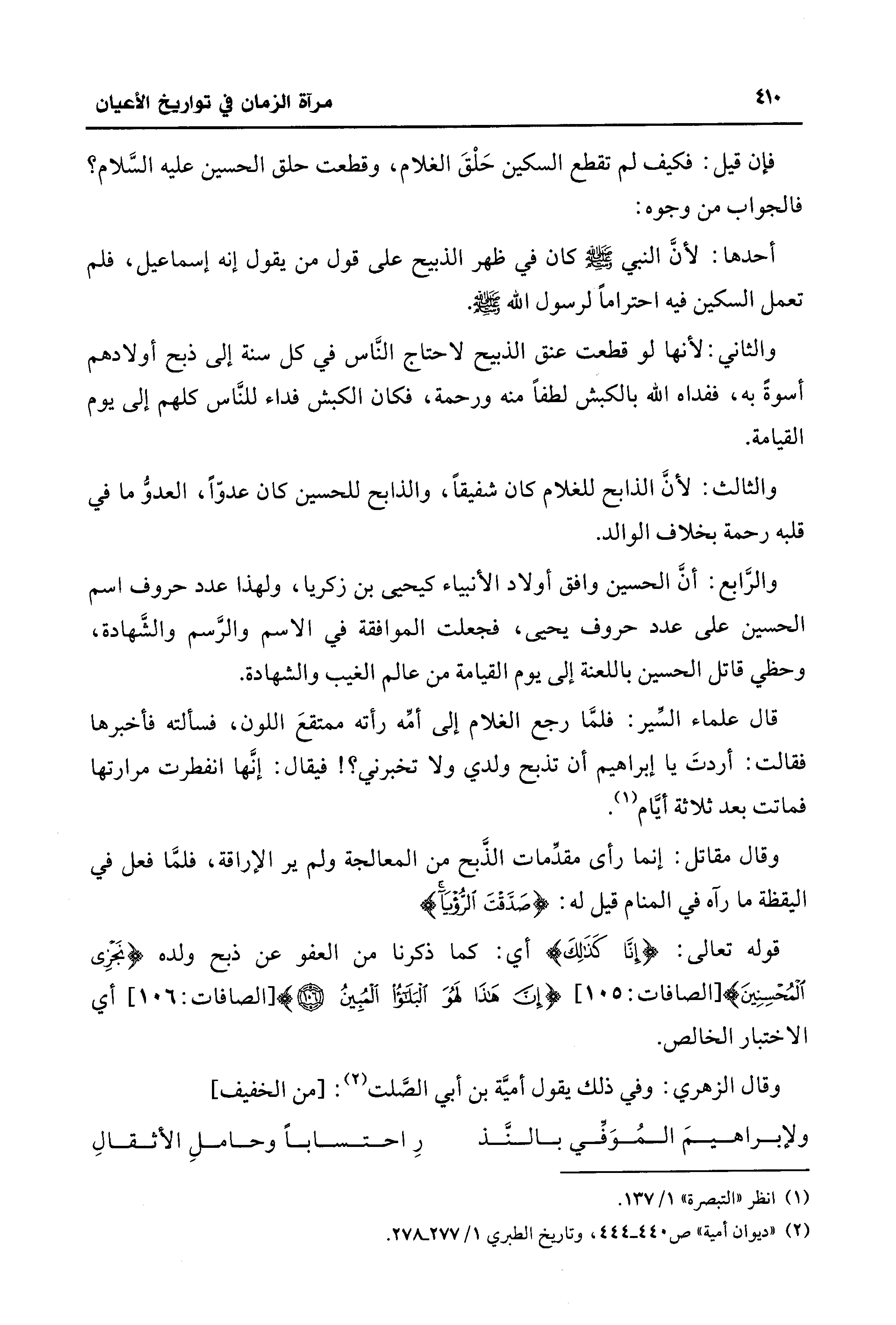 والثاني: لأنها لو قطعت عنق الذبيح لاحتاج النَّاس في كل سنة إلى ذبح أولادهم أسوةً به، ففداه الله بالكبش لطفًا منه ورحمة، فكان الكبش فداء للنَّاس كلهم إلى يوم القيامة.