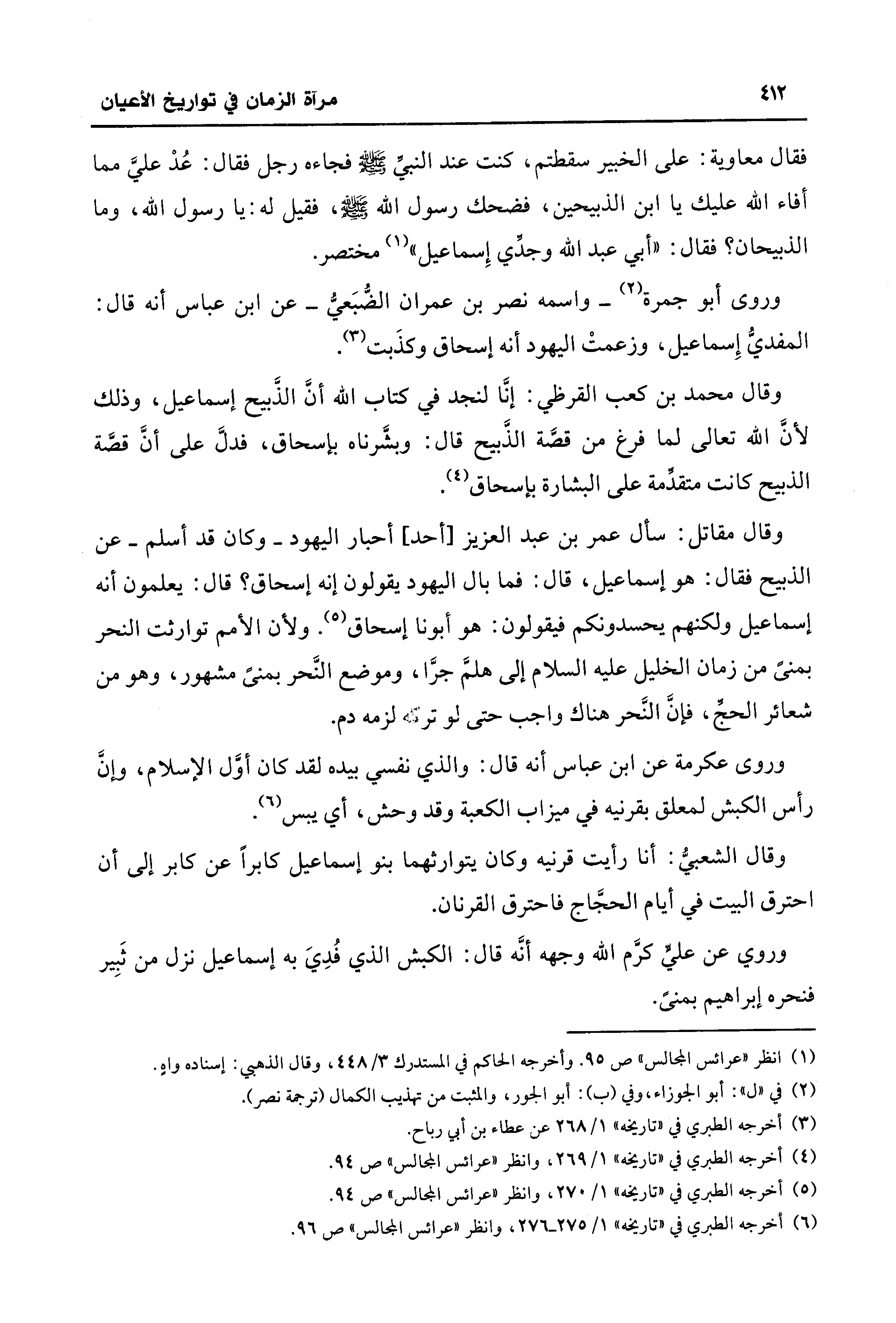 فقال معاوية: على الخبير سقطتم، كنت عند النبيِّ - صلى الله عليه وسلم - فجاءه رجل فقال: عُدْ عليَّ مما أفاء الله عليك يا ابن الذبيحين, فضحك رسول الله - صلى الله عليه وسلم -، فقيل له: يا رسول الله، وما الذبيحان؟ فقال: "أبي عبد الله وجدِّي إِسماعيل" (¬1) مختصر.