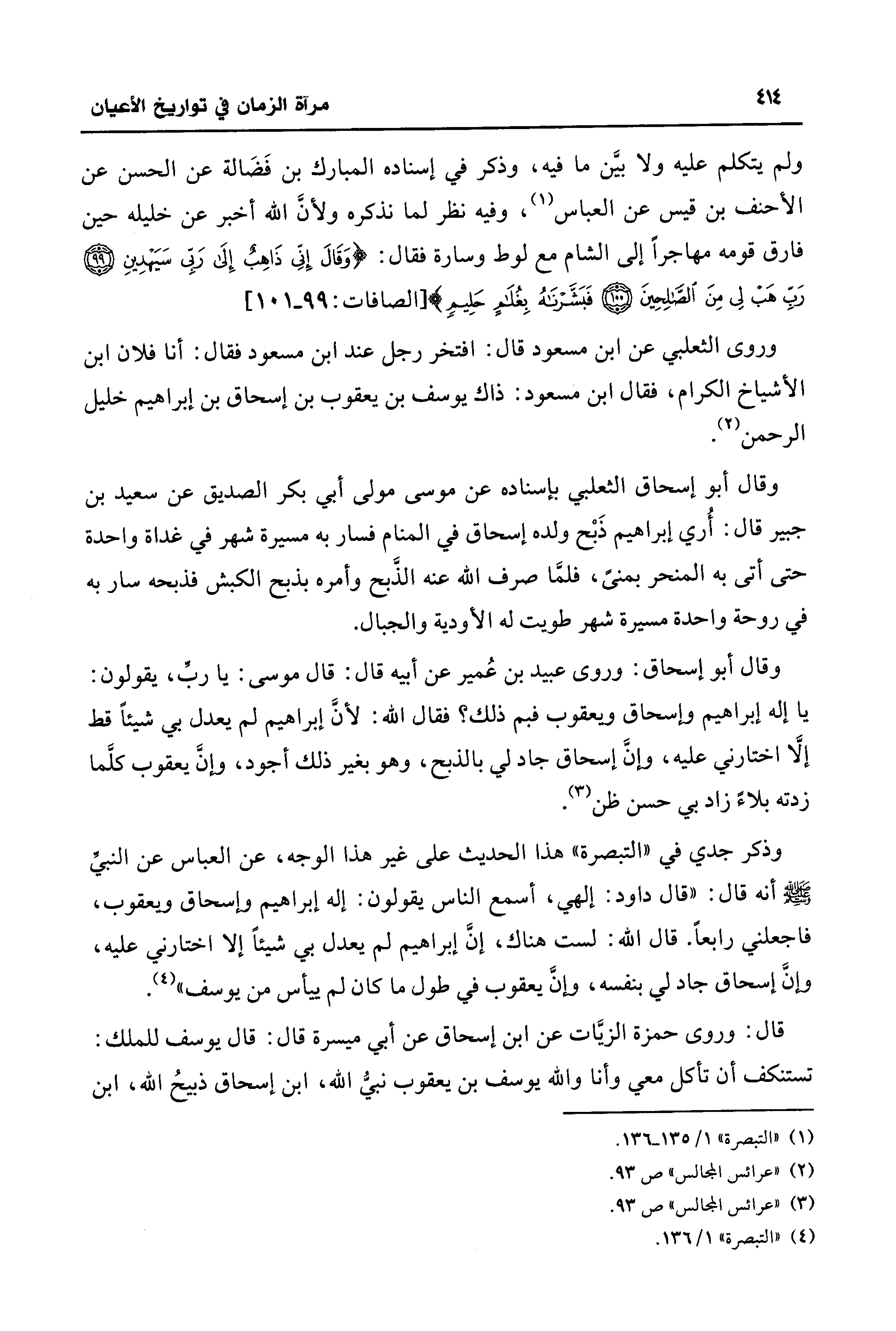 وقال أبو إسحاق: وروى عبيد بن عُمير عن أبيه قال: قال موسى: يا ربِّ، يقولون: يا إله إبراهيم وإسحاق ويعقوب فبم ذلك؟ فقال الله: لأنَّ إبراهيم لم يعدل بي شيئًا قط إلَّا اختارني عليه، وإنَّ إسحاق جاد لي بالذبح، وهو بغير ذلك أجود، وإنَّ يعقوب كلَّما زدته بلاءً زاد بي حسن ظن (¬3).