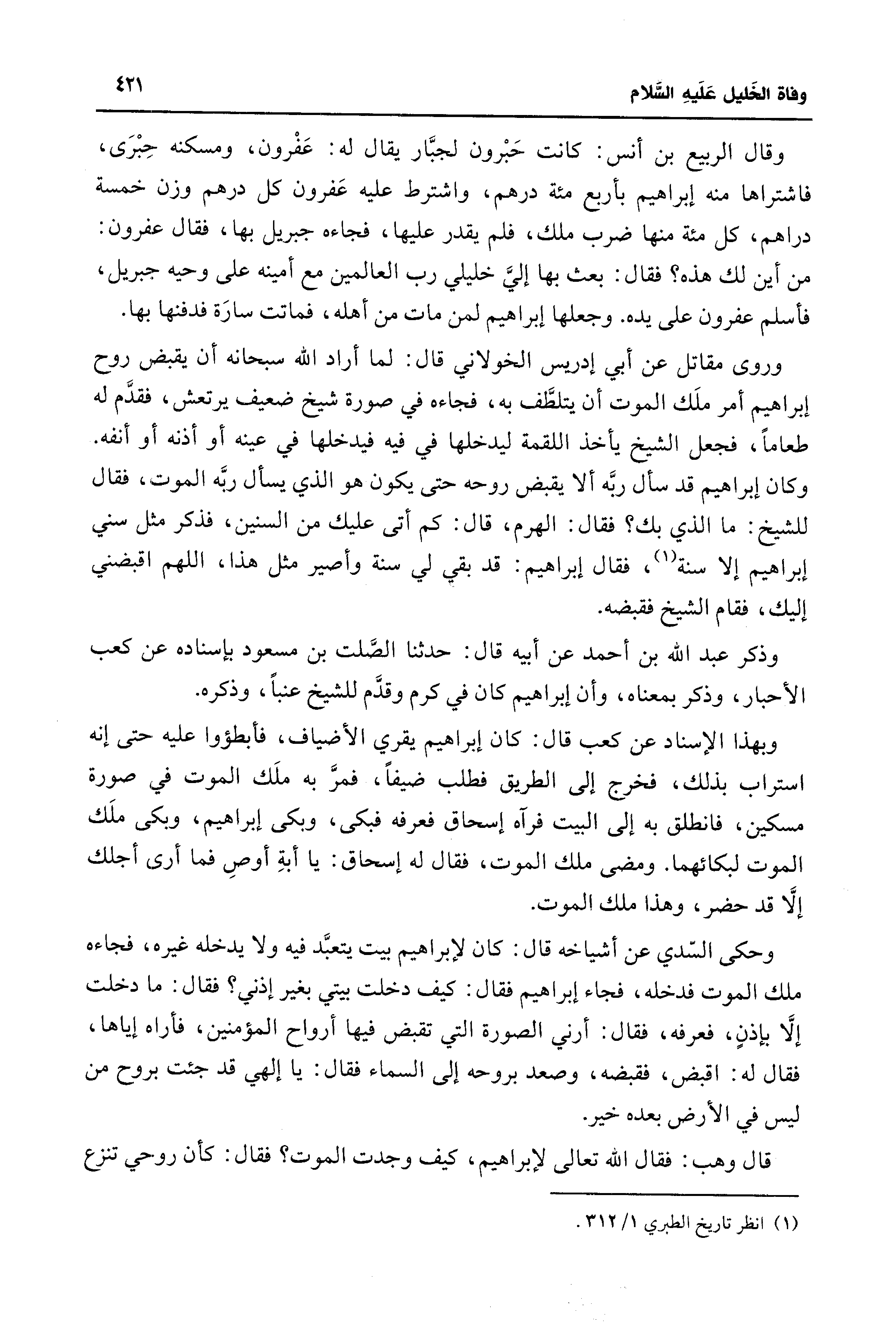 وبهذا الإسناد عن كعب قال: كان إبراهيم يقري الأضياف، فأبطؤوا عليه، حتى إنه استراب بذلك، فخرج إلى الطريق فطلب ضيفًا، فمرَّ به ملَك الموت في صورة مسكين، فانطلق به إلى البيت فرآه إسحاق فعرفه فبكى، وبكى إبراهيم، وبكى ملَك الموت لبكائهما. ومضى ملك الموت، فقال له إسحاق: يا أبةِ أوصِ فما أرى أجلك إلَّا قد حضر، وهذا ملك الموت.