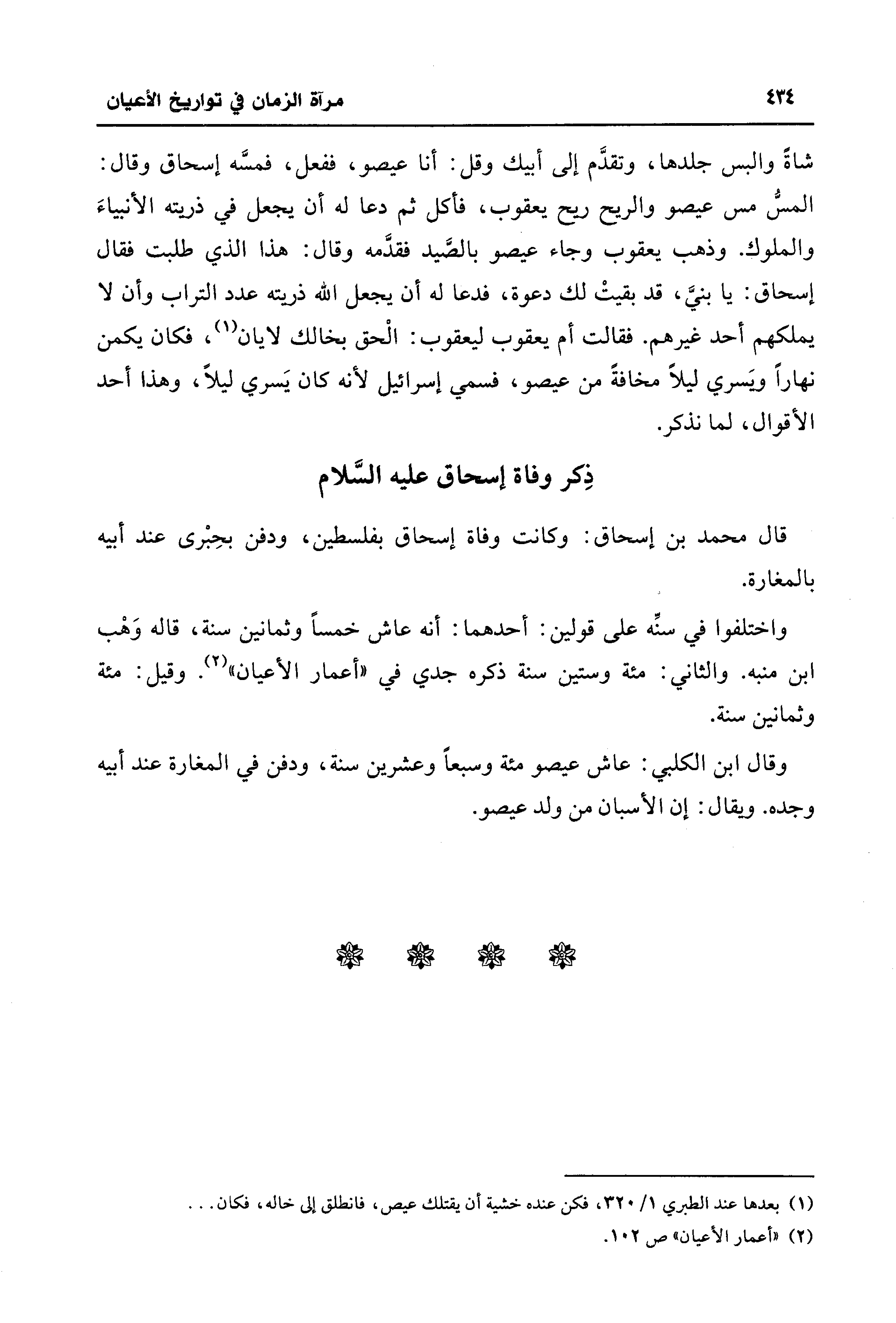 وقال ابن الكلبي: عاش عيصو مئة وسبعًا وعشرين سنة، ودفن في المغارة عند أبيه وجده. ويقال: إن الأسبان من ولد عيصو.