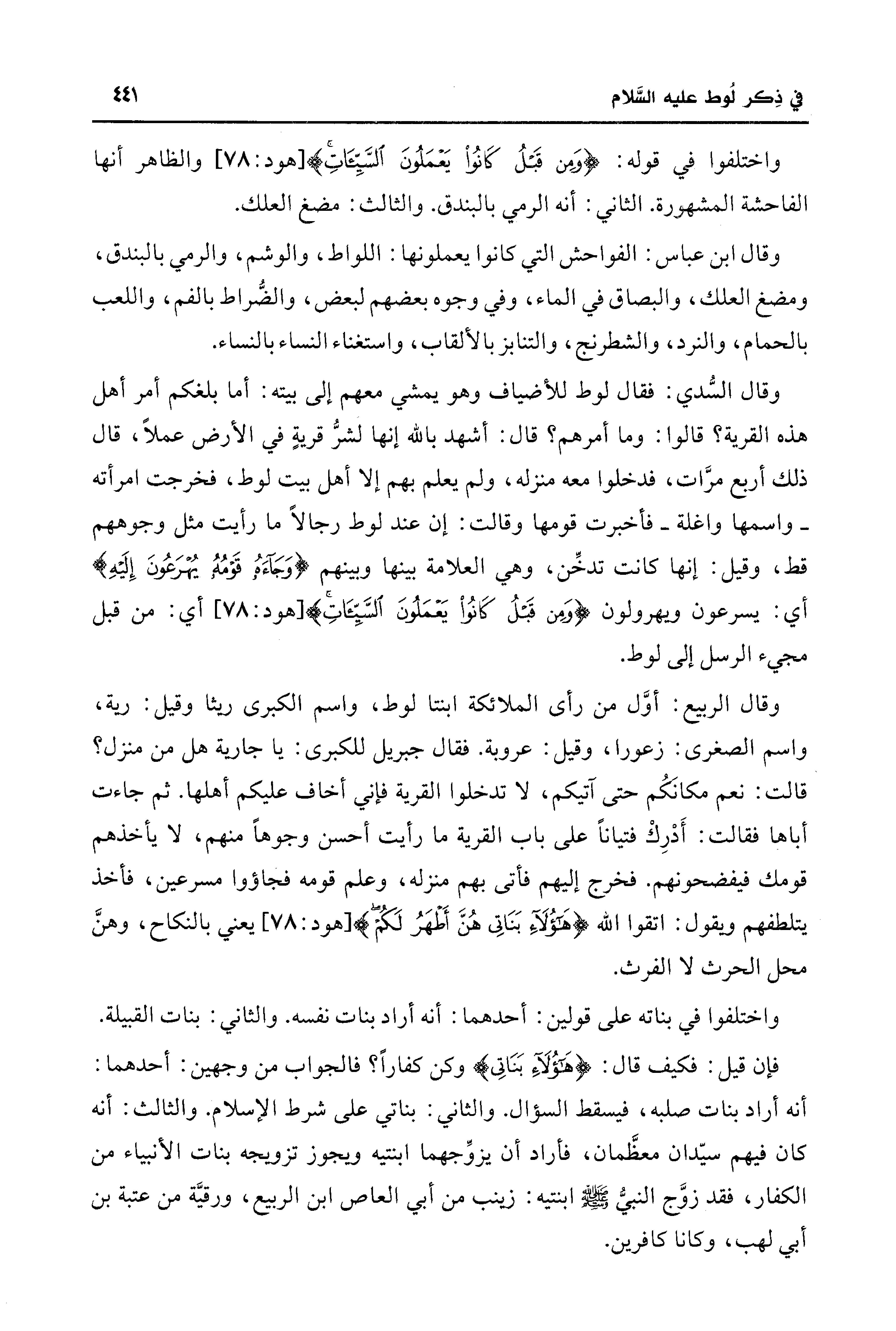 وقال الربيع: أوَّل من رأى الملائكة ابنتا لوط، واسم الكبرى ريثا وقيل: رية، واسم الصغرى: زعورا، وقيل: عروبة. فقال جبريل للكبرى: يا جارية هل من منزل؟ قالت: نعم مكانَكُم حتى آتيكم، لا تدخلوا القرية فإني أخاف عليكم أهلها. ثم جاءت أباها فقالت: أَدْرِكْ فتيانًا على باب القرية ما رأيت أحسن وجوهًا منهم، لا يأخذهم قومك فيفضحونهم. فخرج إليهم فأتى بهم منزله، وعلم قومه فجاؤوا مسرعين، فأخذ يتلطفهم ويقول: اتقوا الله {هَؤُلَاءِ بَنَاتِي هُنَّ أَطْهَرُ لَكُمْ} [هود: 78] يعني بالنكاح، وهنَّ محل الحرث لا الفرث.