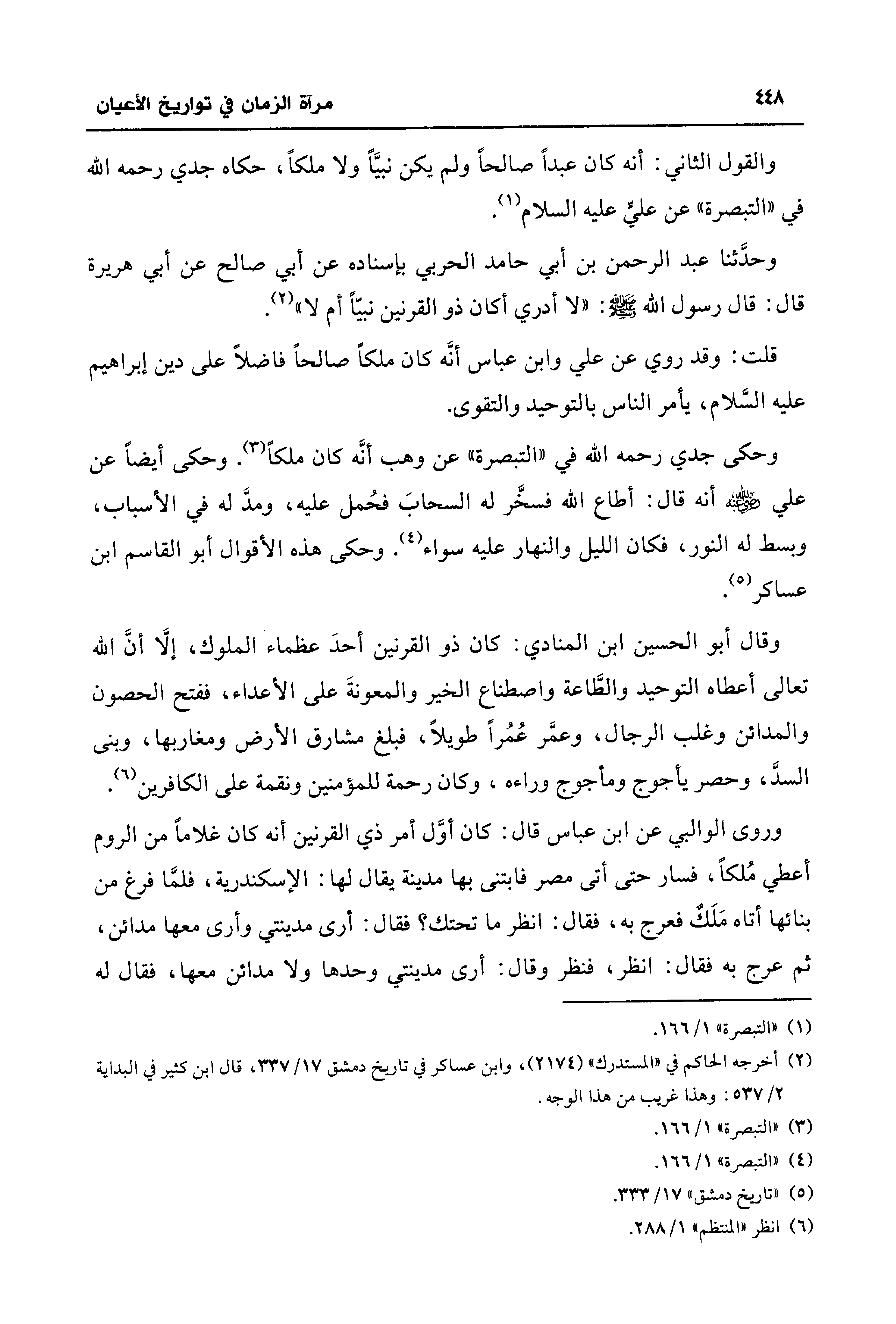 وحكى جدي رحمه الله في "التبصرة" عن وهب أنَّه كان ملكًا (¬3). وحكى أيضًا عن علي - رضي الله عنه - أنَّه قال: أطاع الله فسخَّر له السحابَ فحُمل عليه، ومدَّ له في الأسباب، وبسط له النور، فكان الليل والنهار عليه سواء (¬4). وحكى هذه الأقوال أبو القاسم ابن عساكر (¬5).