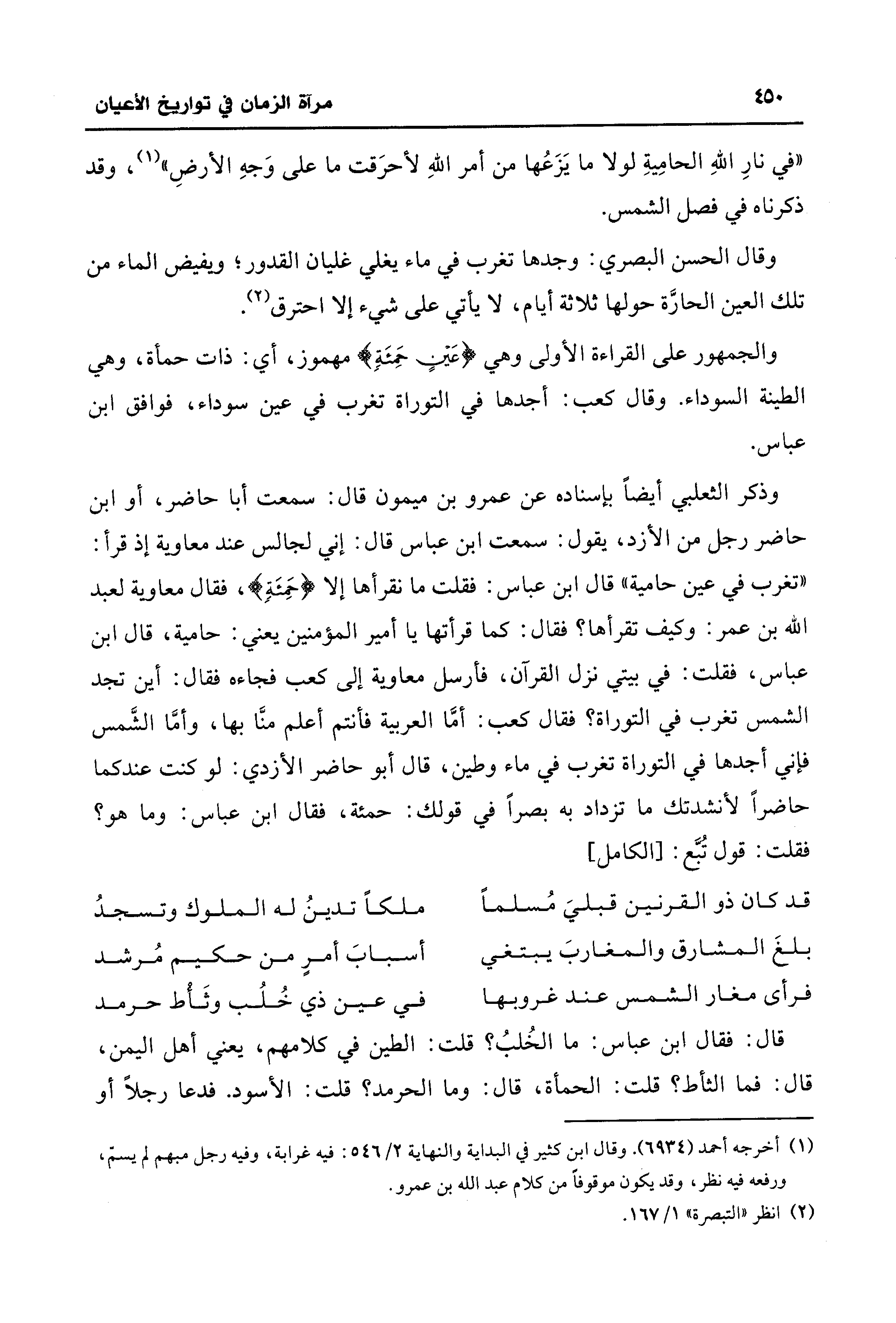 وذكر الثعلبي أيضًا بإسناده عن عمرو بن ميمون قال: سمعت أبا حاضر، أو ابن حاضر رجل من الأزد، يقول: سمعت ابن عباس قال: إنِّي لجالس عند معاوية إذ قرأ: "تغرب في عين حامية" قال ابن عباس: فقلت ما نقرأها إلَّا {حَمِئَةٍ}، فقال معاوية لعبد الله بن عمر: وكيف تقرأها؟ فقال: كما قرأتها يا أمير المؤمنين يعني: حامية، قال ابن عباس، فقلت: في بيتي نزل القرآن، فأرسل معاوية إلى كعب فجاءه فقال: أين تجد الشّمس تغرب في التوراة؟ فقال كعب: أمَّا العربية فأنتم أعلم منَّا بها، وأمَّا الشَّمس فإني أجدها في التوراة تغرب في ماء وطين، قال أبو حاضر الأزدي: لو كنت عندكما حاضرًا لأنشدتك ما تزداد به بصرًا في قولك: حمئة، فقال ابن عباس: وما هو؟ فقلت: قول تُبَّع: [الكامل]
