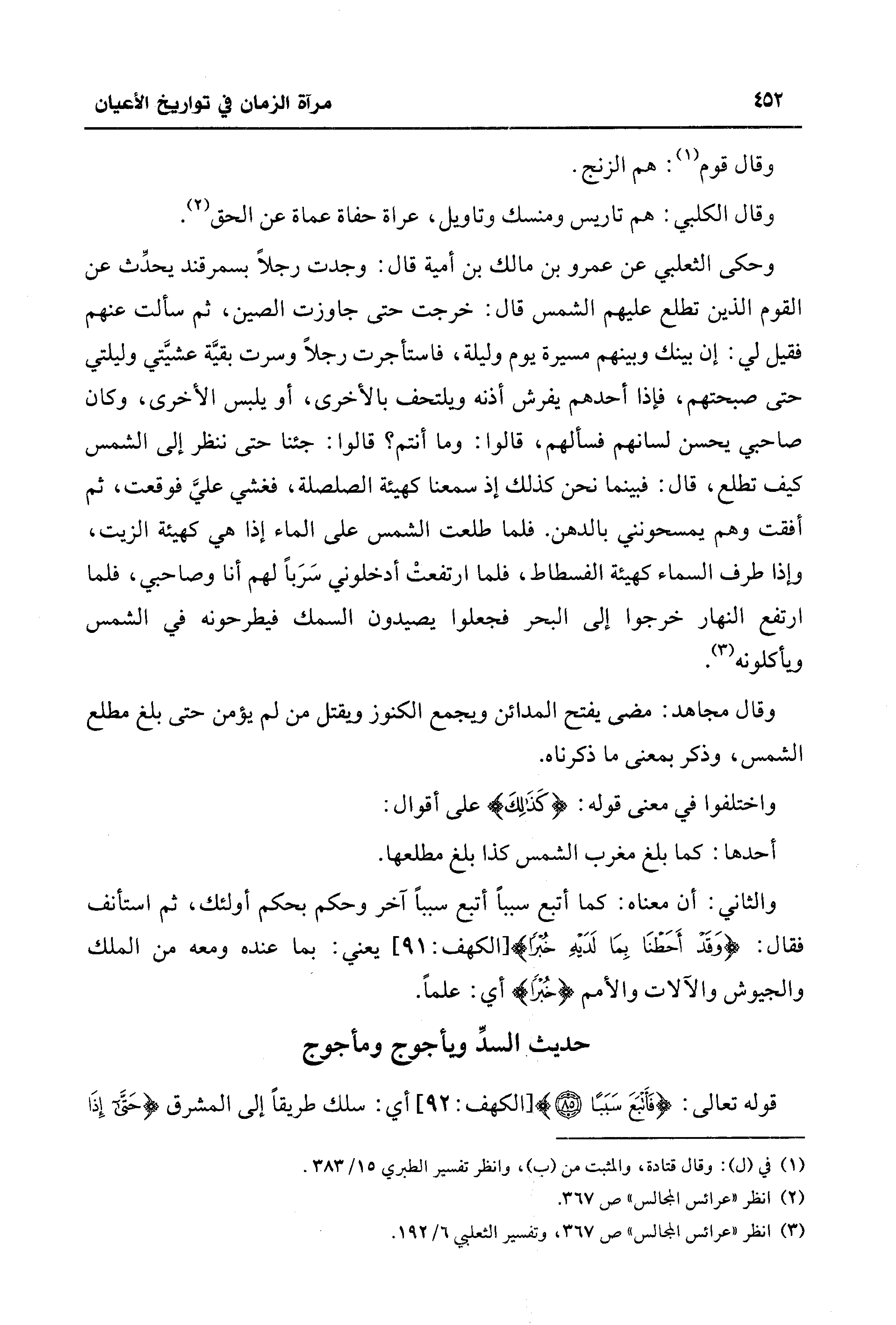 وحكى الثعلبي عن عمرو بن مالك بن أميَّة قال: وجدت رجلًا بسمرقند يحدِّث عن القوم الذين تطلع عليهم الشّمس قال: خرجت حتَّى جاوزت الصين، ثم سألت عنهم فقيل لي: إن بينك وبينهم مسيرة يوم وليلة، فاستأجرت رجلًا وسرت بقيَّة عشيَّتي وليلتي حتَّى صبحتهم، فإذا أحدهم يفرش أذنه ويلتحف بالأخرى، أو يلبس الأخرى، وكان صاحبي يحسن لسانهم فسألهم، قالوا: وما أنتم؟ قالوا: جئنا حتى ننظر إلى الشّمس كيف تطلع، قال: فبينما نحن كذلك إذ سمعنا كهيئة الصلصلة، فغشي عليَّ فوقعت، ثم أفقت وهم يمسحونني بالدهن. فلما طلعت الشّمس على الماء إذا هي كهيئة الزيت، وإذا طرف السماء كهيئة الفسطاط، فلما ارتفعتْ أدخلوني سَرَبًا لهم أنا وصاحبي، فلما ارتفع النهار خرجوا إلى البحر فجعلوا يصيدون السمك فيطرحونه في الشّمس ويأكلونه (¬3).