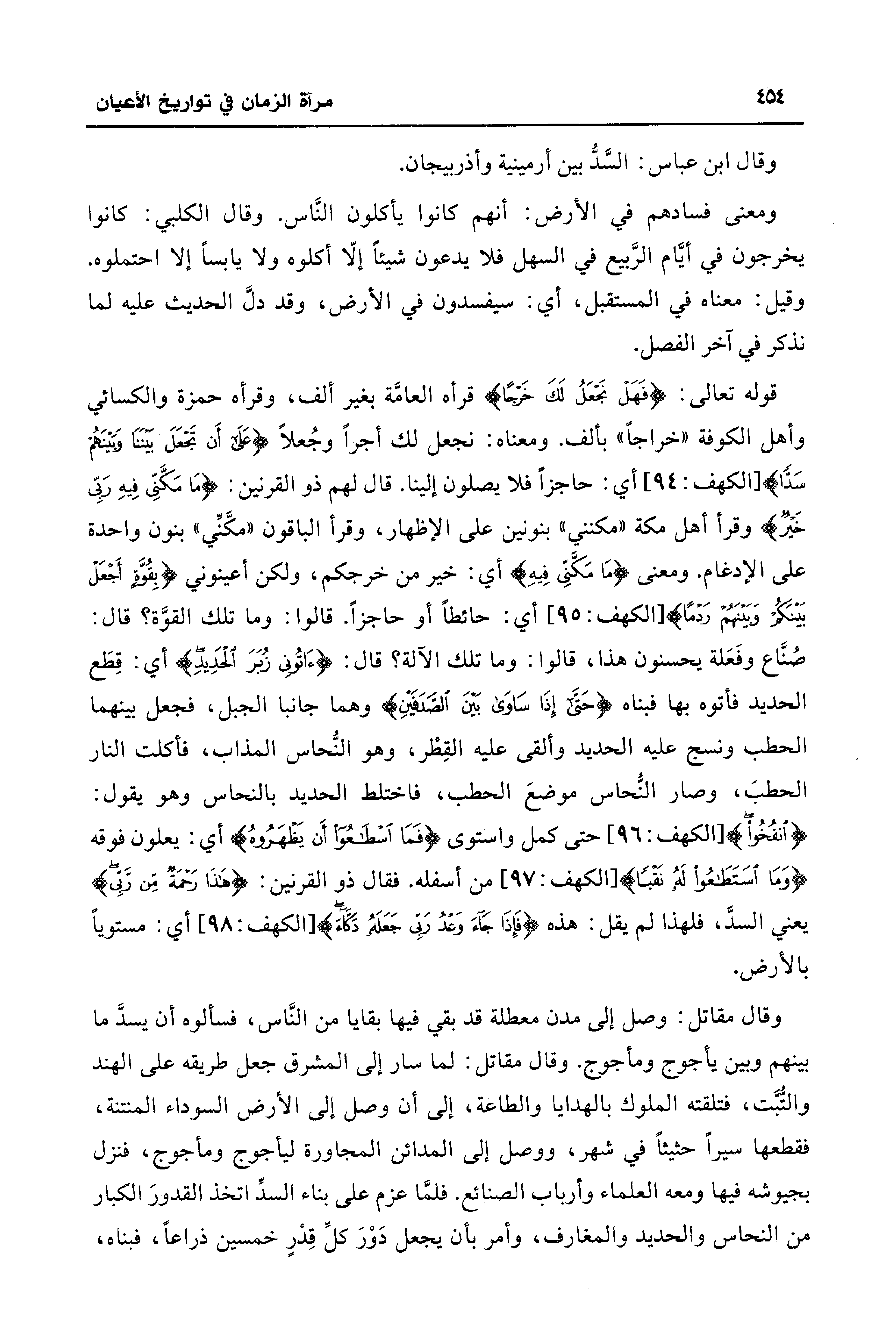 قوله تعالى: {فَهَلْ نَجْعَلُ لَكَ خَرْجًا} قرأه العامَّة بغير ألف، وقرأه حمزة والكسائي وأهل الكوفة "خراجًا" بألف. ومعناه: نجعل لك أجرًا وجُعلًا {عَلَى أَنْ تَجْعَلَ بَينَنَا وَبَينَهُمْ سَدًّا} [الكهف: 94] أي: حاجزًا فلا يصلون إلينا. قال لهم ذو القرنين: {مَا مَكَّنِّي فِيهِ رَبِّي خَيرٌ} وقرأ أهل مكّة "مكنني" بنونين على الإظهار، وقرأ الباقون "مكَّنِّي" بنون واحدة على الإدغام. ومعنى {مَا مَكَّنِّي فِيهِ} أي: خير من خرجكم، ولكن أعينوني {بِقُوَّةٍ أَجْعَلْ بَينَكُمْ وَبَينَهُمْ رَدْمًا} [الكهف: 95] أي: حائطًا أو حاجزًا. قالوا: وما تلك القوَّة؟ قال: صُنَّاع وفَعَلة يحسنون هذا، قالوا: وما تلك الآلة؟ قال: {آتُونِي زُبَرَ الْحَدِيدِ} أي: قِطَع الحديد فأتوه بها فبناه {حَتَّى إِذَا سَاوَى بَينَ الصَّدَفَينِ} وهما جانبا الجبل، فجعل بينهما الخطيب ونسج عليه الحديد وألقى عليه القِطْر، وهو النُّحاس المذاب، فأكلت النَّار الخطيب، وصار النُّحاس موضعَ الخطيب، فاختلط الحديد بالنحاس وهو يقول: {انْفُخُوا} [الكهف: 96] حتَّى كمل واستوى {فَمَا اسْطَاعُوا أَنْ يَظْهَرُوهُ} أي: يعلون فوقه {وَمَا اسْتَطَاعُوا لَهُ نَقْبًا} [الكهف: 97] من أسفله. فقال ذو القرنين: {هَذَا رَحْمَةٌ مِنْ رَبِّي} يعني السدَّ، فلهذا لم يقل: هذه {فَإِذَا جَاءَ وَعْدُ رَبِّي جَعَلَهُ دَكَّاءَ} [الكهف: 98] أي: مستويًا بالأرض.