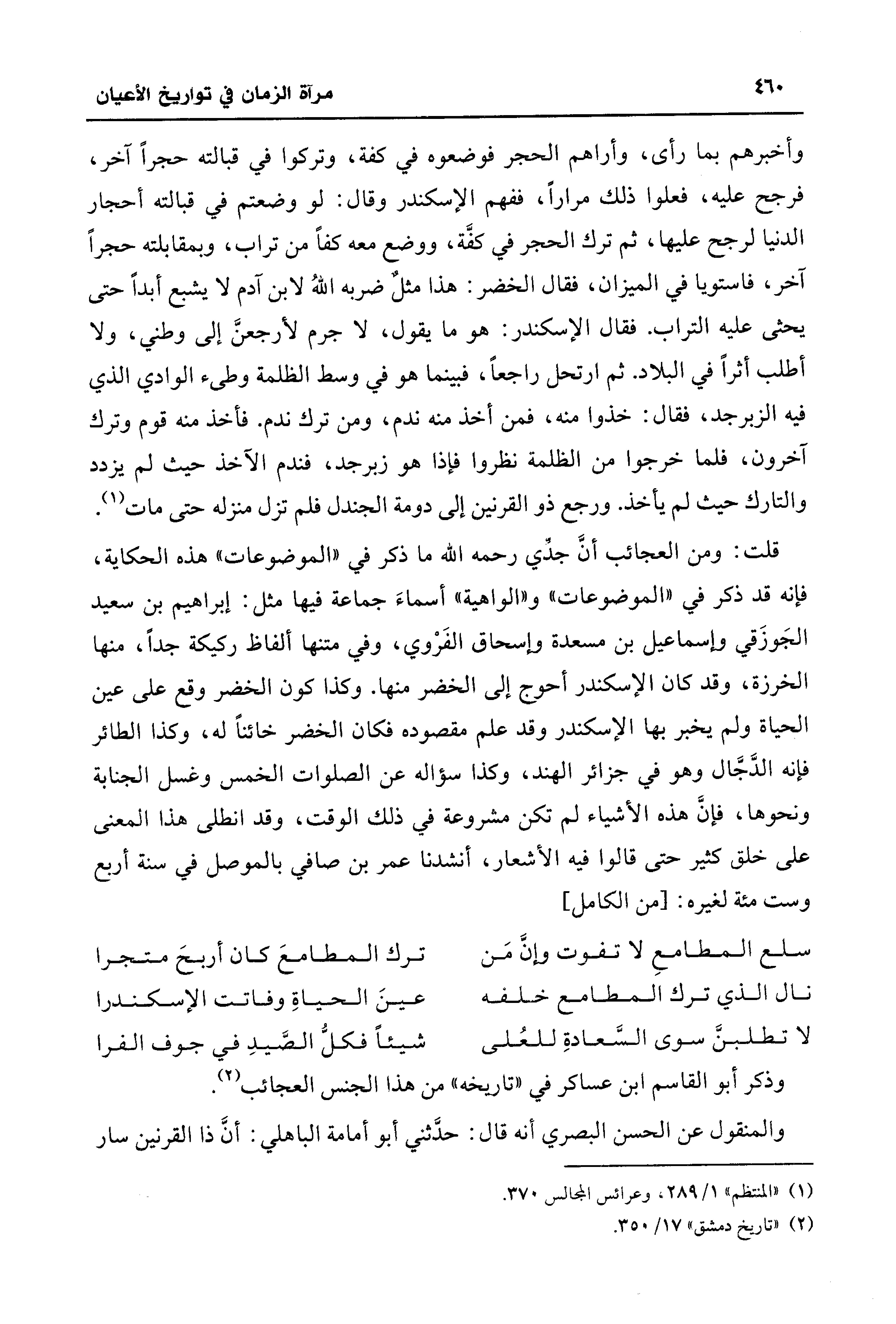 قلت: ومن العجائب أنَّ جدِّي رحمه الله ما ذكر في "الموضوعات" هذه الحكاية، فإنَّه قد ذكر في "الموضوعات" و "الواهية" أسماءَ جماعة فيها مثل: إبراهيم بن سعيد الجَوزَقي وإسماعيل بن مسعدة وإسحاق الفَرْوي، وفي متنها ألفاظ ركيكة جدًّا، منها الخرزة، وقد كان الإسكندر أحوج إلى الخضر منها. وكذا كون الخضر وقع على عين الحياة ولم يخبر بها الإسكندر وقد علم مقصوده فكان الخضر خائنًا له، وكذا الطائر فإنَّه الدَّجَّال وهو في جزائر الهند، وكذا سؤاله عن الصلوات الخمس وغسل الجنابة ونحوها، فإن هذه الأشياء لم تكن مشروعة في ذلك الوقت، وقد انطلى هذا المعنى على خلق كثير حتَّى قالوا فيه الأشعار، أنشدنا عمر بن صافي بالموصل في سنة أربع وست مئة لغيره: [من الكامل]
