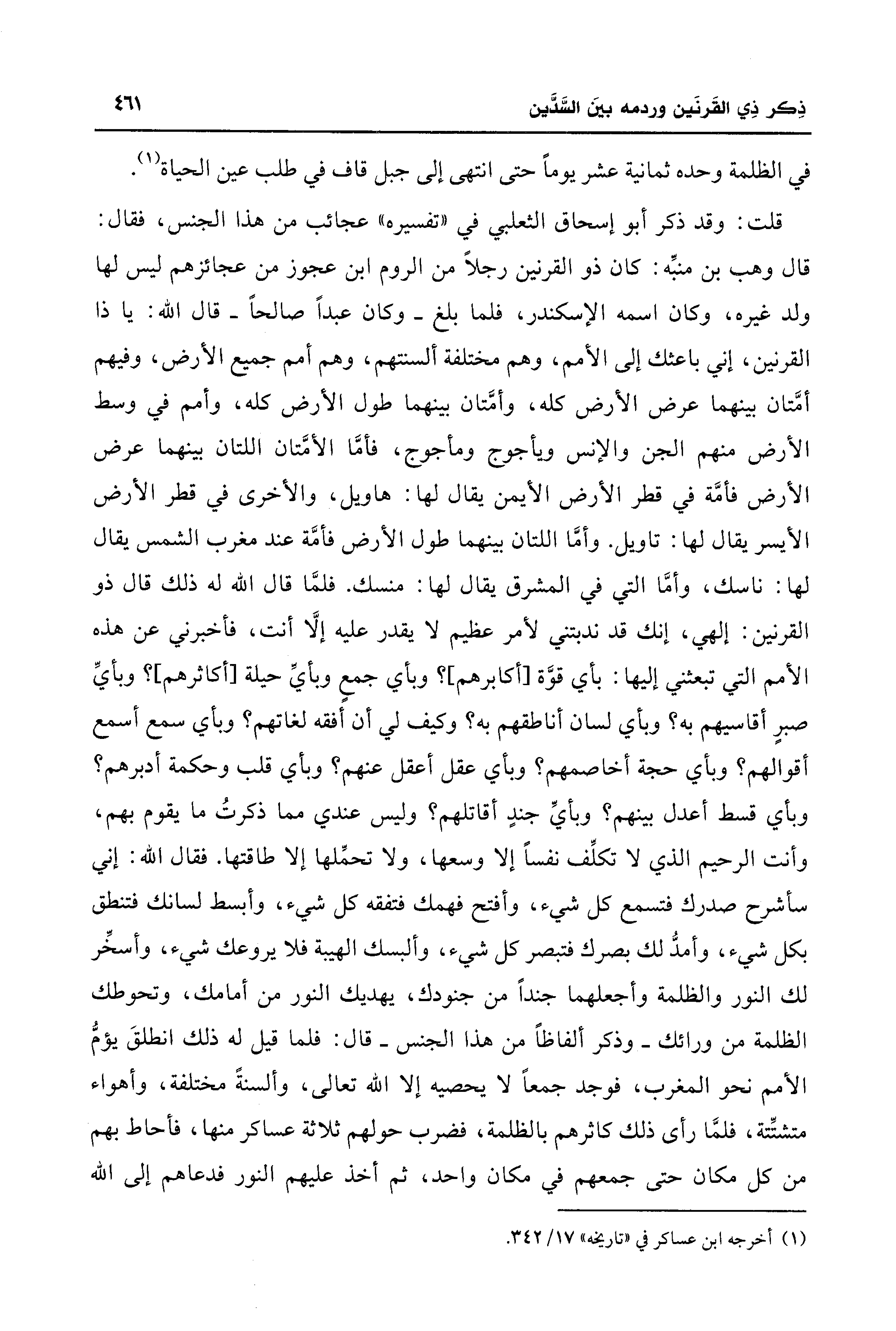 قلت: وقد ذكر أبو إسحاق الثعلبي في "تفسيره" عجائب من هذا الجنس، فقال: قال وهب بن منبِّه: كان ذو القرنين رجلًا من الروم ابن عجوز من عجائزهم ليس لها ولد غيره، وكان اسمه الإسكندر، فلما بلغ -وكان عبدًا صالحًا- قال الله: يا ذا القرنين، إنِّي باعثك إلى الأمم، وهم مختلفة ألسنتهم، وهم أمم جميع الأرض، وفيهم أمَّتان بينهما عرض الأرض كله، وأمَّتان بينهما طول الأرض كله، وأمم في وسط الأرض منهم الجن والإنس ويأجوج ومأجوج، فأمَّا الأمَّتان اللتان بينهما عرض الأرض فأمَّة في قطر الأرض الأيمن يقال لها: هاويل، والأخرى في قطر الأرض الأيسر يقال لها: تأويل. وأمَّا اللتان بينهما طول الأرض فأمَّة عند مغرب الشَّمس يقال لها: ناسك، وأمَّا التي في المشرق يقال لها: منسك. فلمَّا قال الله له ذلك قال ذو القرنين: إلهي، إنك قد ندبتني لأمر عظيم لا يقدر عليه إلَّا أنت، فأخبرني عن هذه الأمم التي تبعثني إلها: بأي قوَّة [أكابرهم]؟ وبأي جمعٍ وبأيِّ حيلة [أكاثرهم]؟ وبأيِّ صبرٍ أقاسيهم به؟ وبأي لسان أناطقهم به؟ وكيف لي أن أفقه لغاتهم؟ وبأي سمع أسمع أقوالهم؟ وبأي حجة أخاصمهم؟ وبأي عقل أعقل عنهم؟ وبأي قلب وحكمة أدبرهم؟ وبأي قسط أعدل بينهم؟ وبأيِّ جندٍ أقاتلهم؟ وليس عندي ممَّا ذكرتُ ما يقوم بهم، وأنت الرحيم الذي لا تكلِّف نفسًا إلَّا وسعها، ولا تحمِّلها إلَّا طاقتها. فقال الله: إنِّي سأشرح صدرك فتسمع كل شيء، وأفتح فهمك فتفقه كل شيء، وأبسط لسانك فتنطق بكلِّ شيء، وأمدُّ لك بصرك فتبصر كل شيء، وألبسك الهيبة فلا يروعك شيء، وأسخِّر لك النور والظلمة وأجعلهما جندًا من جنودك، يهديك النور من أمامك، وتحوطك الظلمة من ورائك -وذكر ألفاظًا من هذا الجنس- قال: فلما قيل له ذلك انطلقَ يؤمُّ الأمم نحو المغرب، فوجد جمعًا لا يحصيه إلَّا الله تعالى، وألسنةً مختلفة، وأهواء متشتِّتة، فلمَّا رأى ذلك كاثرهم بالظلمة، فضرب حولهم ثلاثة عساكر منها، فأحاط بهم من كل مكان حتَّى جمعهم في مكان واحد، ثم أخذ عليهم النور فدعاهم إلى الله