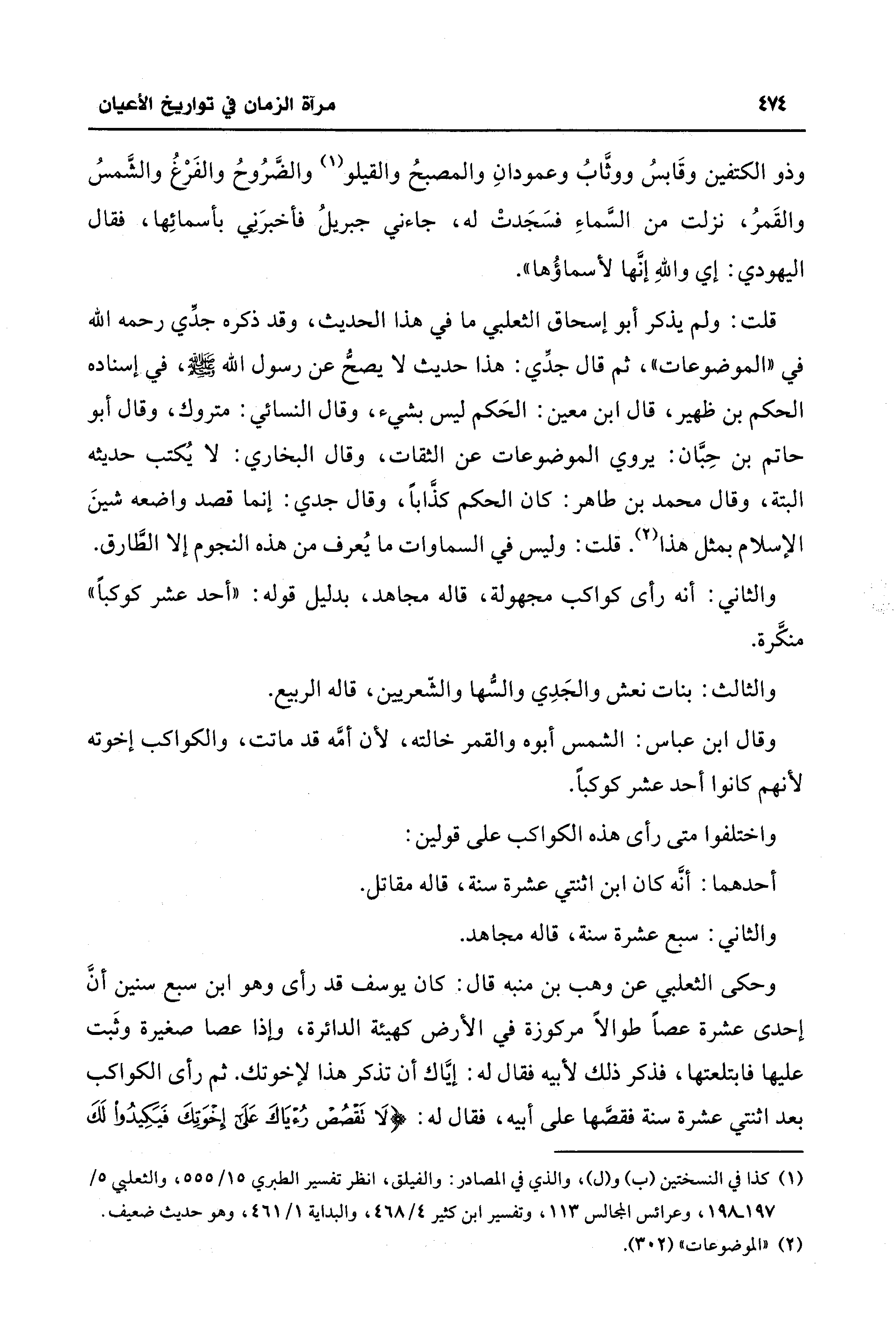 قلت: ولم يذكر أبو إسحاق الثعلبي ما في هذا الحديث، وقد ذكره جدِّي رحمه الله في "الموضوعات"، ثم قال جدِّي: هذا حديث لا يصحُّ عن رسول الله - صَلَّى الله عليه وسلم-، في إسناده الحكم بن ظهير، قال ابن معين: الحَكم ليس بشيء، وقال النَّسائيّ: متروك، وقال أبو حاتم بن حِبَّان: يروي الموضوعات عن الثقات، وقال البُخاريّ: لا يُكتب حديثه البتة، وقال محمد بن طاهر: كان الحكم كذَّابًا، وقال جدِّي: إنَّما قصد واضعه شينَ الإسلام بمثل هذا (¬2). قلت: وليس في السماوات ما يُعرف من هذه النجوم إلَّا الطَّارق.