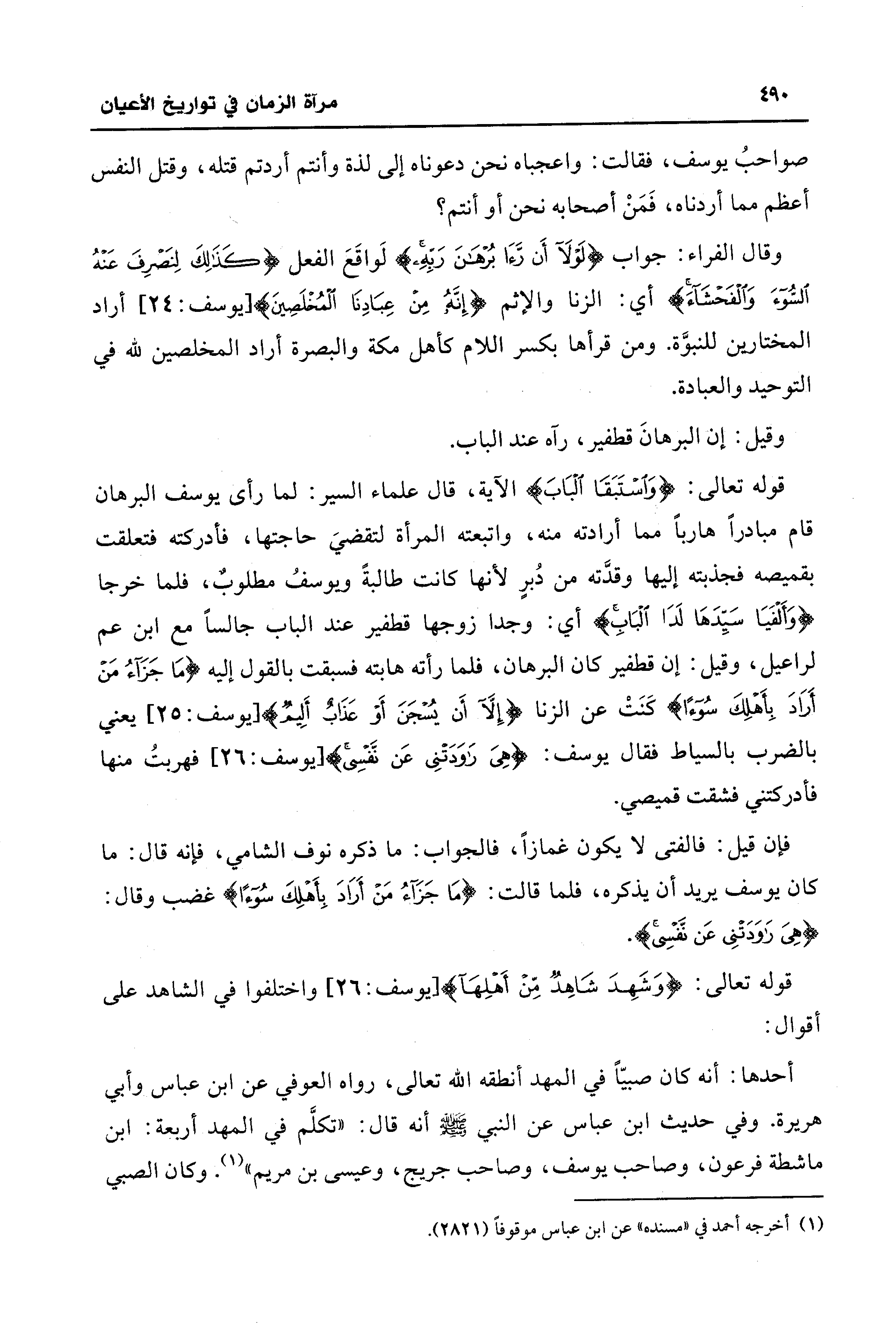 قوله تعالى: {وَاسْتَبَقَا الْبَابَ} الآية، قال علماء السير: لما رأى يوسف البرهان قام مبادرًا هاربًا ممَّا أرادته منه، واتبعته المرأة لتقضيَ حاجتها، فأدركته فتعلقت بقميصه فجذبته إليها وقدَّته من دُبرٍ لأنها كانت طالبةً وبوسفُ مطلوبٌ، فلما خرجا {وَأَلْفَيَا سَيِّدَهَا لَدَى الْبَابِ} أي: وجدا زوجها قطفير عند الباب جالسًا مع أبن عم لراعيل، وقيل: أن قطفير كان البرهان، فلما رأته هابته فسبقت بالقول إليه {مَا جَزَاءُ مَنْ أَرَادَ بِأَهْلِكَ سُوءًا} كَنَتْ عن الزنا {إلا أَنْ يُسْجَنَ أَوْ عَذَابٌ أَلِيمٌ} [يوسف: 25] يعني بالضرب بالسياط فقال يوسف: {هِيَ رَاوَدَتْنِي عَنْ نَفْسِي} فهربتُ منها فأدركتني فشقت قميصي.