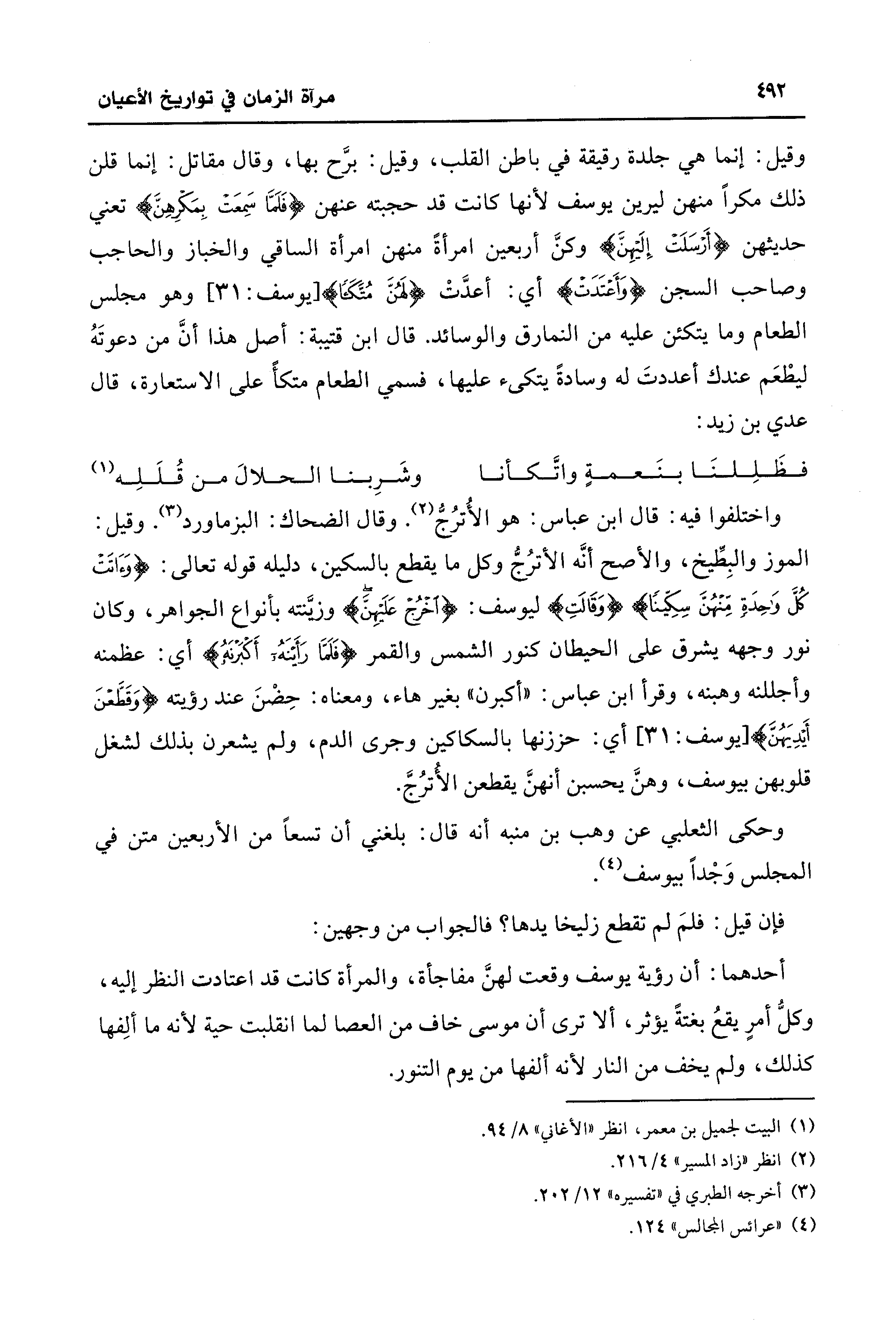 واختلفوا فيه: قال ابن عباس: هو الأُترُجُّ (¬2). وقال الضَّحَّاك: البزماورد (¬3). وقيل: الموز والبِطِّيخ، والأصح أنَّه الأترُجُّ وكل ما يقطع بالسكين، دليله قوله تعالى: {وَآتَتْ كُلَّ وَاحِدَةٍ مِنْهُنَّ سِكِّينًا} {وَقَالتِ} ليوسف: {اخْرُجْ عَلَيهِنَّ} وزيَّنته بأنواع الجواهر، وكان نور وجهه يشرق على الحيطان كنور الشَّمس والقمر {فَلَمَّا رَأَينَهُ أَكْبَرْنَهُ} أي: عظمنه وأجللنه وهبنه، وقرأ ابن عباس: "أكبرن" بغير هاء، ومعناه: حِضْنَ عند رؤيته {وَقَطَّعْنَ أَيدِيَهُنَّ} [يوسف: 31] أي: حززنها بالسكاكين وجرى الدّم، ولم يشعرن بذلك لشغل قلوبهن بيوسف، وهنَّ يحسبن أنهنَّ يقطعن الأُترُجَّ.