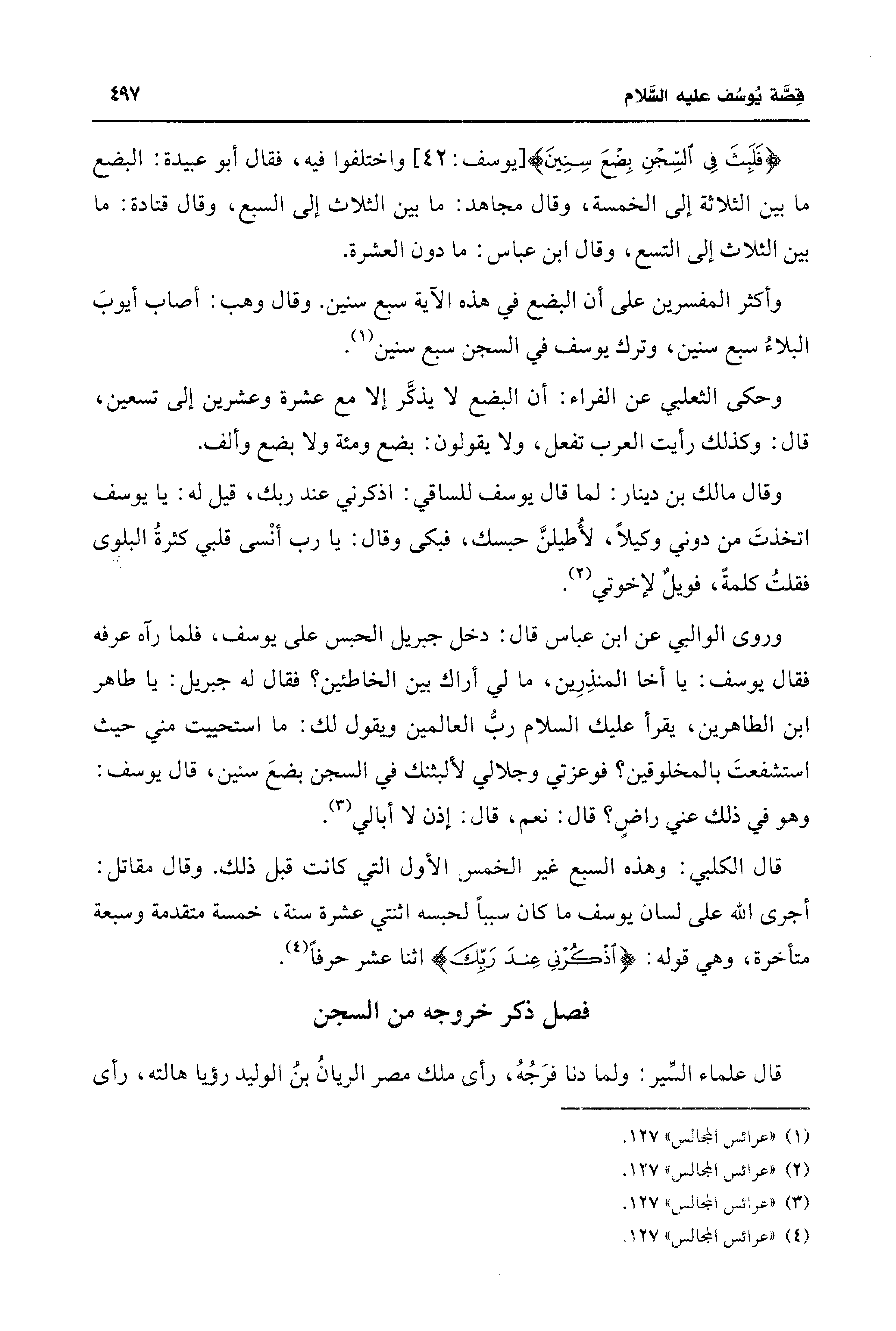 وروى الوالبي عن ابن عباس قال: دخل جبريل الحبس على يوسف، فلما رآه عرفه فقال يوسف: يا أخا المنذِرِين، ما لي أراك بين الخاطئين؟ فقال له جبريل: يا طاهر ابن الطاهرين، يقرأ عليك السلام ربُّ العالمين ويقول لك: ما استحييت مني حيث استشفعتَ بالمخلوقين؟ فوعزتي وجلالي لألبثنك في السجن بضعَ سنين، قال يوسف: وهو في ذلك عني راضٍ؟ قال: نعم، قال: إذن لا أبالي (¬3).