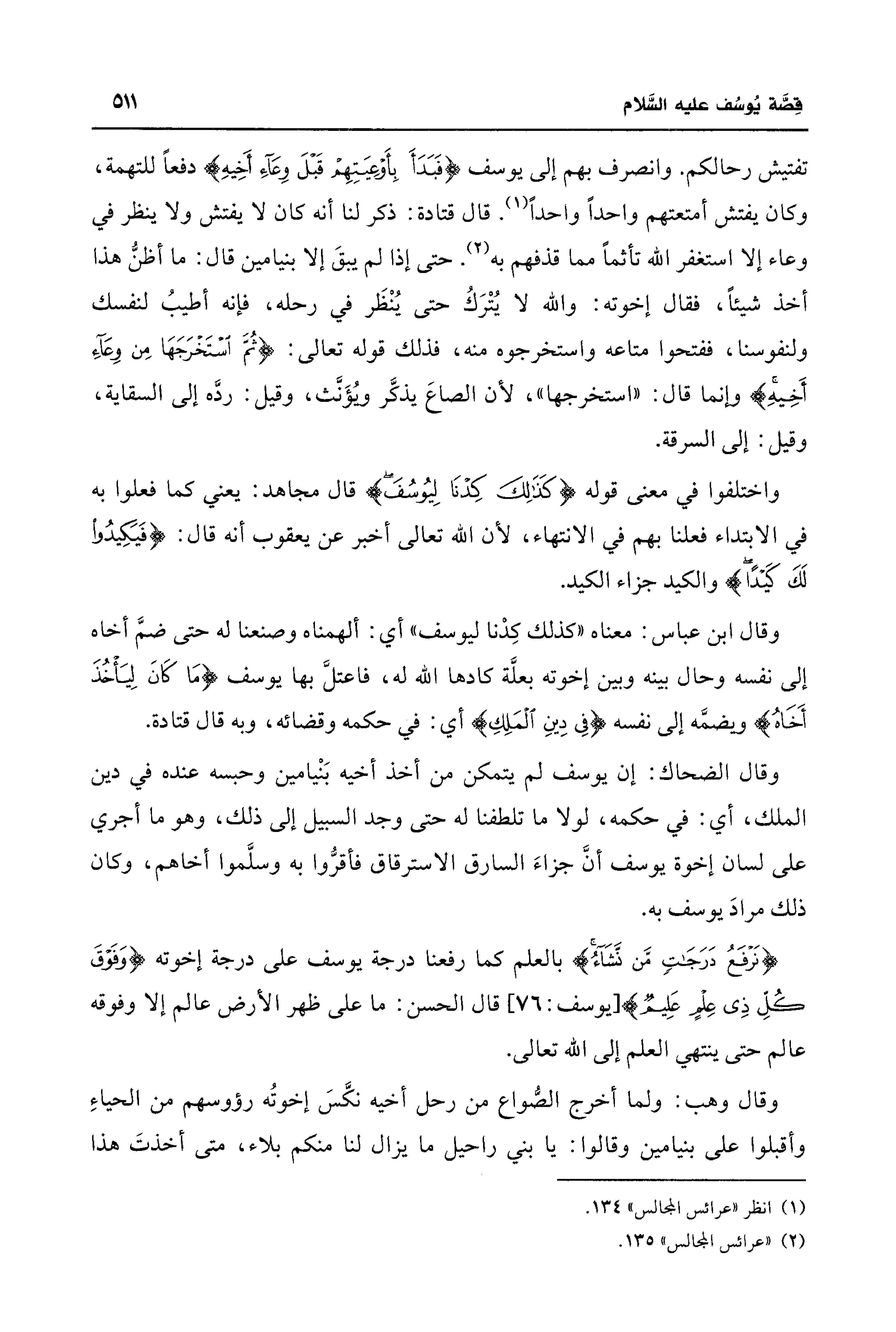 تفتيش رحالكم. وانصرف بهم إلى يوسف {فَبَدَأَ بِأَوْعِيَتِهِمْ قَبْلَ وعَاءِ أَخِيهِ} دفعًا للتهمة، وكان يفتش أمتعتهم واحدًا واحدًا (¬1). قال قتادة: ذكر لنا أنَّه كان لا يفتش ولا ينظر في وعاء إلا استغفر الله تأثمًا مما قذفهم به (¬2). حتَّى إذا لم يبقَ إلا بنيامين قال: ما أظنُّ هذا أخذ شيئًا، فقال إخوته: والله لا يُتْرَكُ حتَّى يُنْظَر في رحله، فإنه أطيبُ لنفسك ولنفوسنا، ففتحوا متاعه واستخرجوه منه، فذلك قوله تعالى: {ثُمَّ استَخرَجَهَا مِن وعَاءِ أَخِيهِ} وإنما قال: "استخرجها"، لأن الصاعَ يذكَّر ويؤَنَّث، وقيل: ردَّه إلى السقاية، وقيل: إلى السرقة.