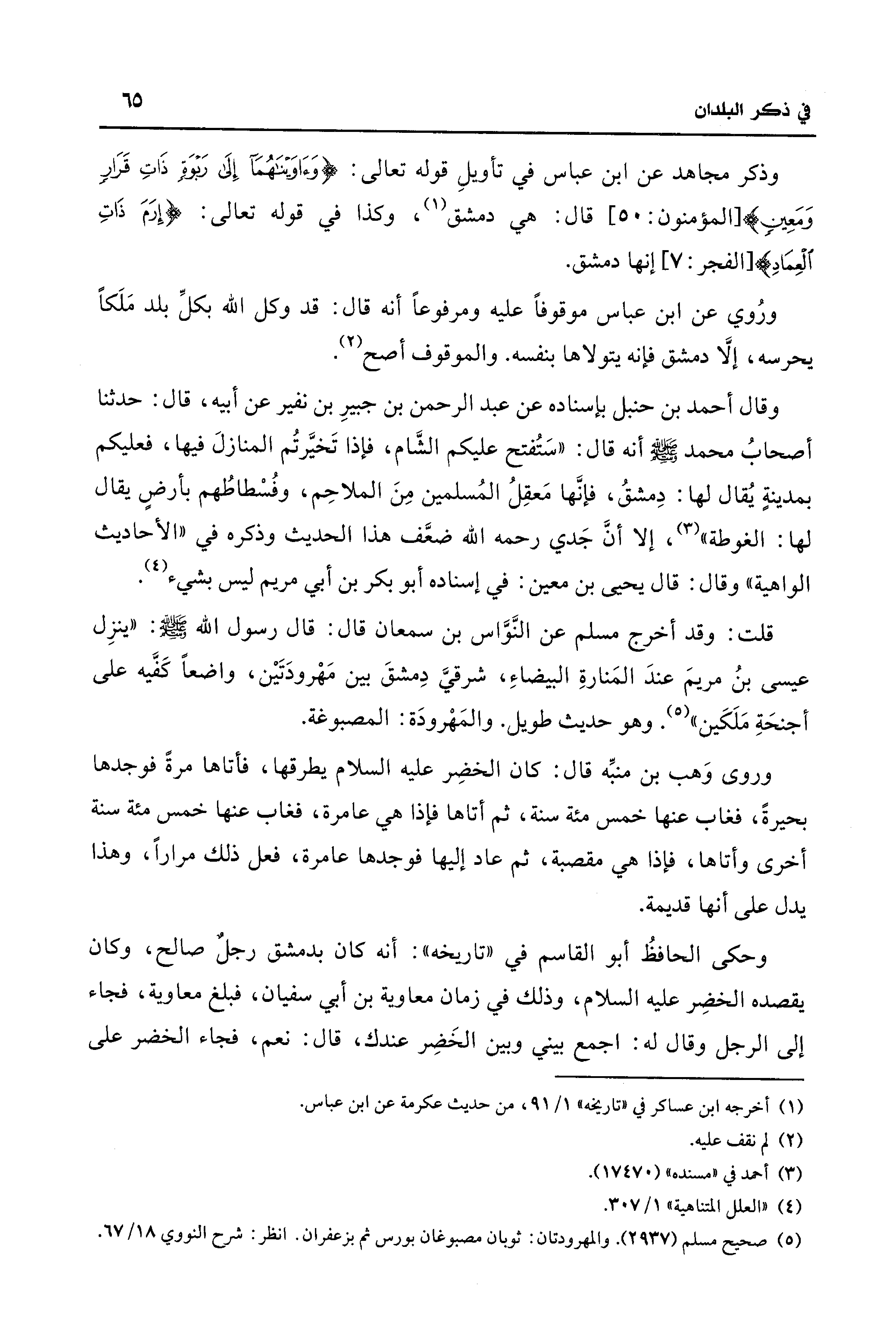 وذكر مجاهد عن ابن عباس في تأويلِ قوله تعالى: {وَآوَينَاهُمَا إِلَى رَبْوَةٍ ذَاتِ قَرَارٍ وَمَعِينٍ} [المؤمنون: 50] قال: هي دمشق (¬1)، وكذا في قوله تعالى: {إِرَمَ ذَاتِ الْعِمَادِ} [الفجر: 7] إنها دمشق.