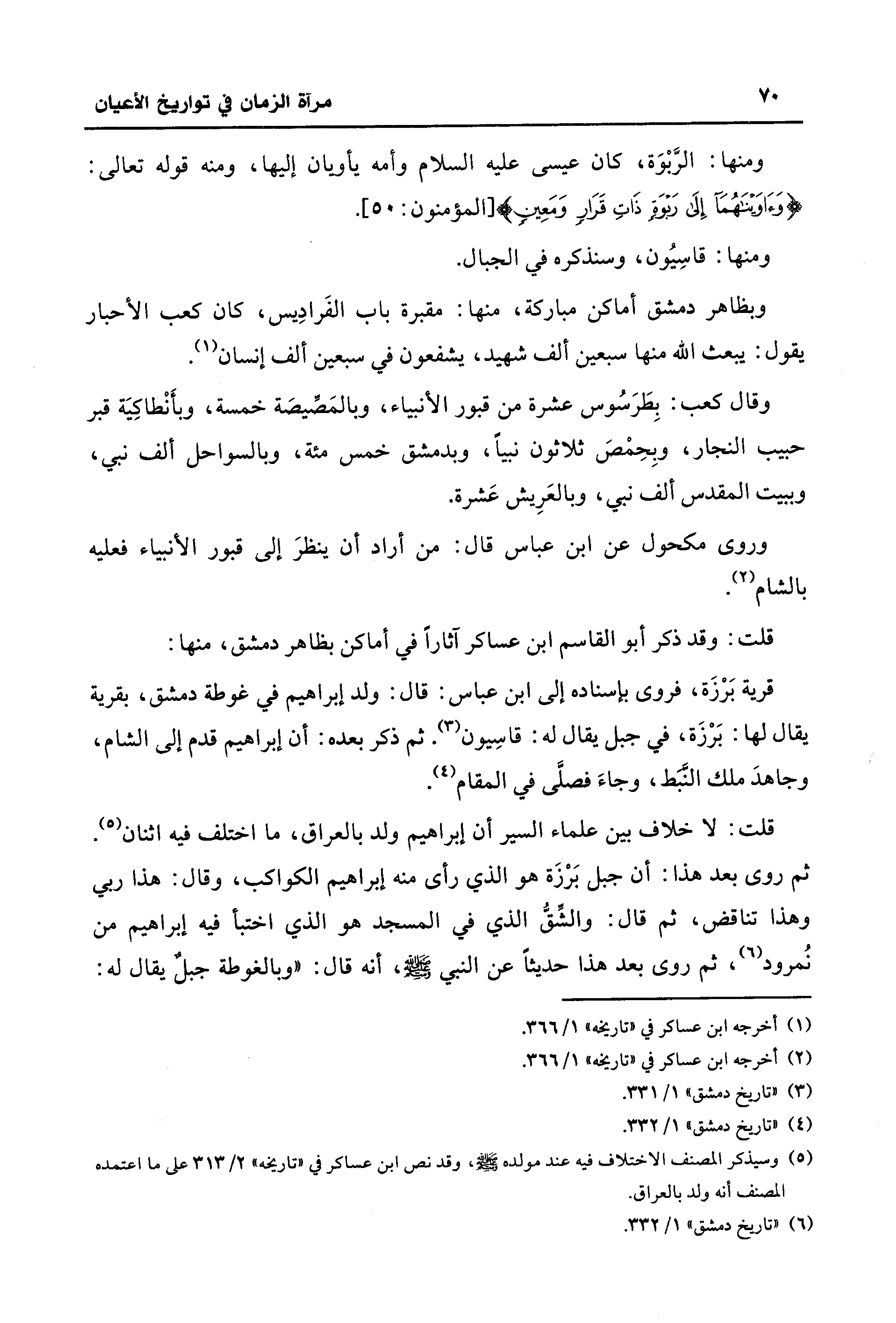 قرية بَرْزَة، فروى بإسناده إلى ابن عباس: قال: ولد إبراهيم في غوطة دمشق، بقرية يقال لها: بَرْزَة، في جبل يقال له: قاسِيون (¬3). ثم ذكر بعده: أن إبراهيم قدم إلى الشام، وجاهدَ ملك النَّبَط، وجاءَ فصلَّى في المقام (¬4).