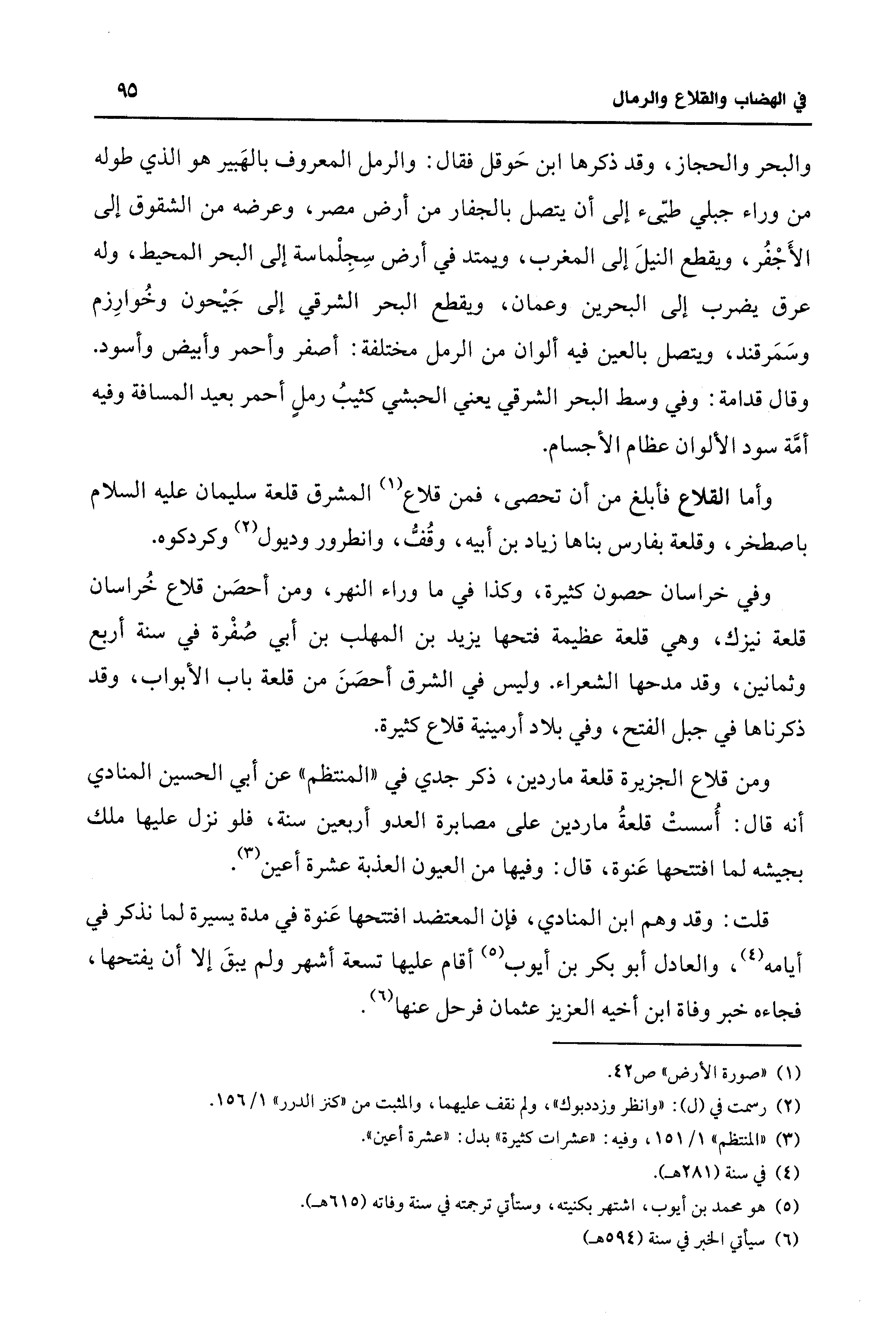 والبحر والحجاز، وقد ذكرها ابن حَوقل فقال: والرمل المعروف بالهَبير هو الذي طوله من وراء جبلي طييّء إلى أن يتصل بالجفار من أرض مصر، وعرضه من الشقوق إلى الأَجْفُر، ويقطع النيلَ إلى المغرب، ويمتد في أرض سِجِلْماسة إلى البحر المحيط، وله عرق يضرب إلى البحرين وعمان، ويقطع البحر الشرقي إلى جَيحون وخُوارِزم وسَمَرقند، ويتصل بالعين فيه ألوان من الرمل مختلفة: أصفر وأحمر وأبيض وأسود. وقال قدامة: وفي وسط البحر الشرقي يعني الحبشي كثيبُ رملٍ أحمر بعيد المسافة وفيه أمَّة سود الألوان عظام الأجسام.