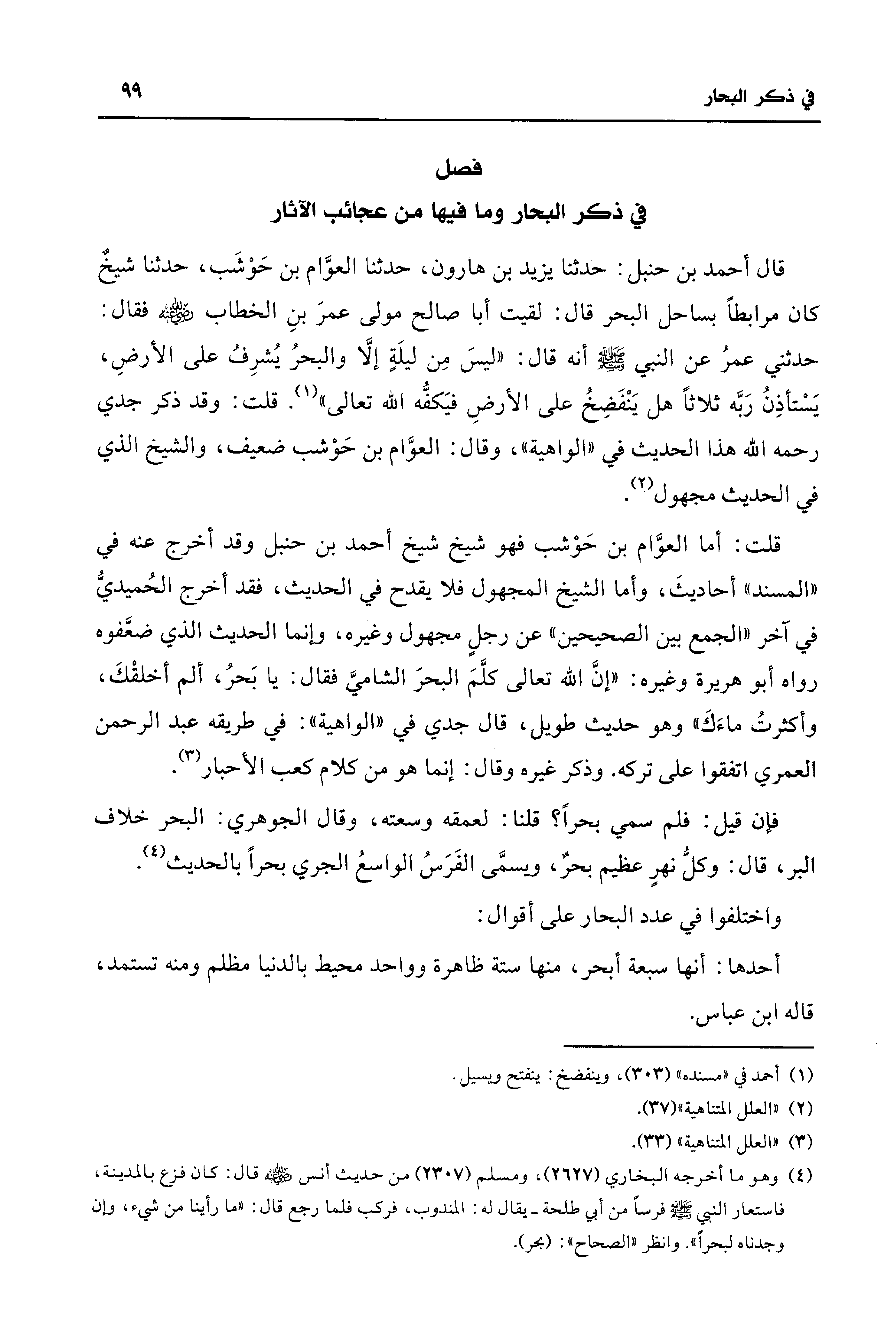 قال أحمد بن حنبل: حدثنا يزيد بن هارون، حدثنا العوَّام بن حَوْشَب، حدثنا شيخٌ كان مرابطًا بساحل البحر قال: لقيت أبا صالح مولى عمرَ بنِ الخطاب - رضي الله عنه - فقال: حدثني عمرُ عن النبي - صلى الله عليه وسلم - أنه قال: "ليسَ مِن ليلَةٍ إلَّا والبحرُ يُشرِفُ على الأرضِ، يَسْتأذِنُ رَبَّه ثلاثًا هل يَنْفَضِخُ على الأرضِ فيَكفُّه الله تعالى" (¬1). قلت: وقد ذكر جدي رحمه الله هذا الحديث في "الواهية"، وقال: العوَّام بن حَوْشب ضعيف، والشيخ الذي في الحديث مجهول (¬2).