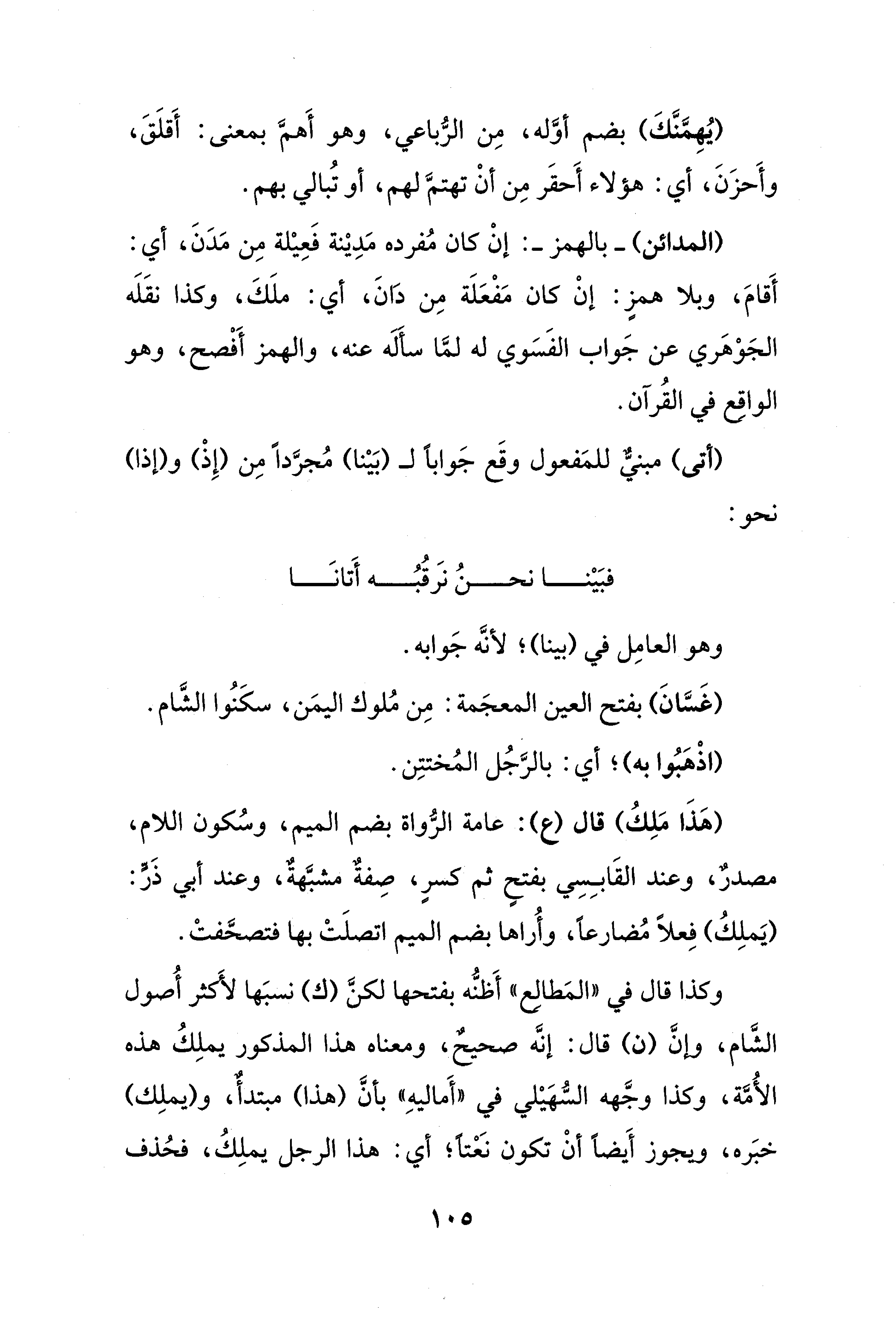 (المدائن) -بالهمز-: إنْ كان مُفرده مَدِيْنة فَعِيْلة مِن مَدَنَ، أي: أَقامَ، وبلا همزٍ: إنْ كان مَفْعَلَة مِن دَانَ، أي: ملَكَ، وكذا نقَلَه الجَوْهَري عن جَواب الفَسَوي له لمَّا سألَه عنه، والهمز أَفْصح، وهو الواقِع في القُرآن.