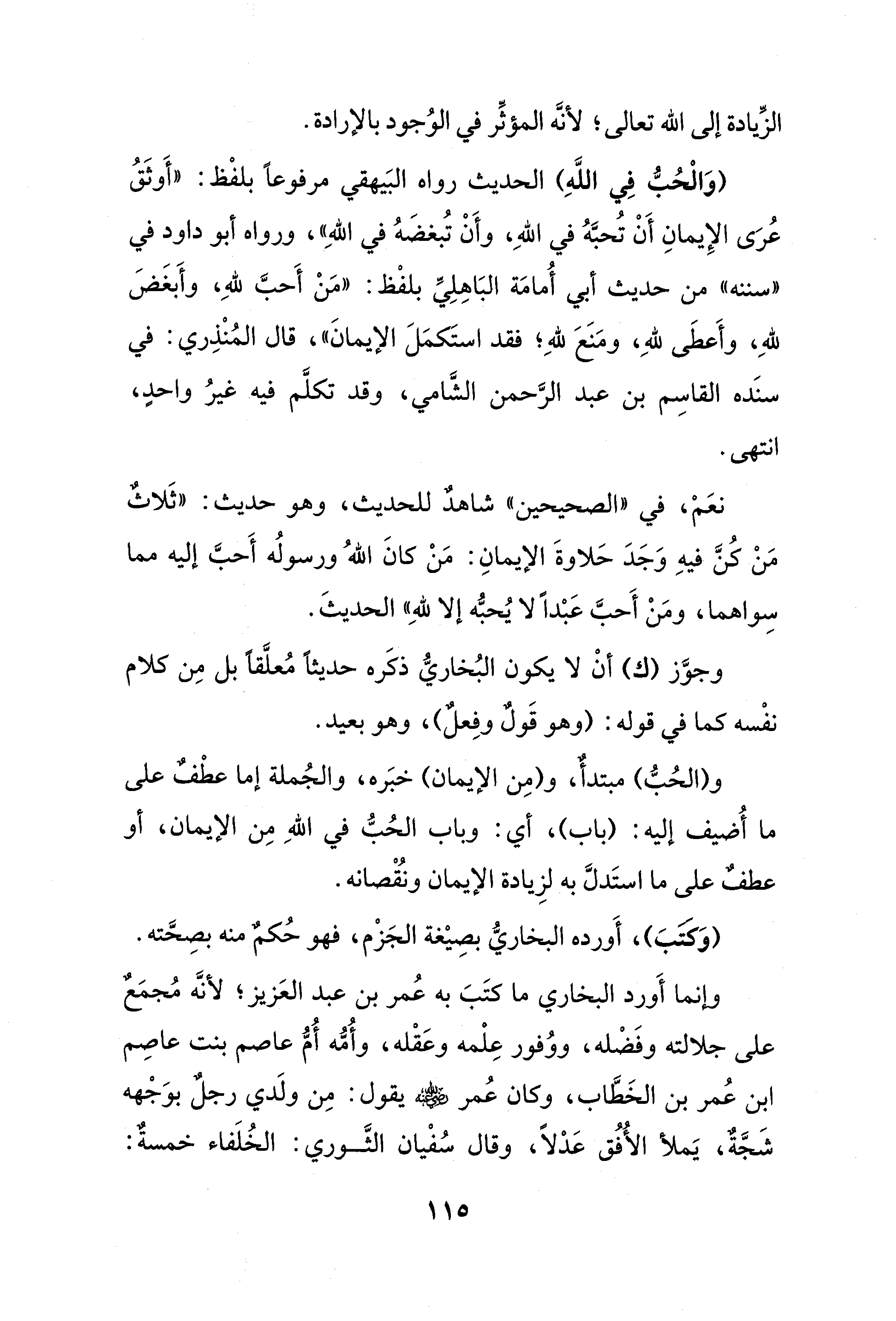 (وَالْحُبُّ فِي اللَّهِ) الحديث رواه البَيهقي مرفوعًا بلفْظ: "أَوثَقُ عُرَى الإِيمانِ أَنْ تُحبَّهُ في اللهِ، وأَنْ تُبغضَهُ في اللهِ"، ورواه أبو داود في "سننه" من حديث أبي أُمامَة البَاهِلِيِّ بلفْظ: "مَنْ أَحبَّ للهِ، وأَبغَضَ للهِ، وأَعطَى للهِ، ومَنَعَ للهِ؛ فقد استَكمَلَ الإيمانَ"، قال المُنْذِري: في سنَده القاسِم بن عبد الرَّحمن الشَّامي، وقد تكلَّم فيه غيرُ واحدٍ، انتهى.