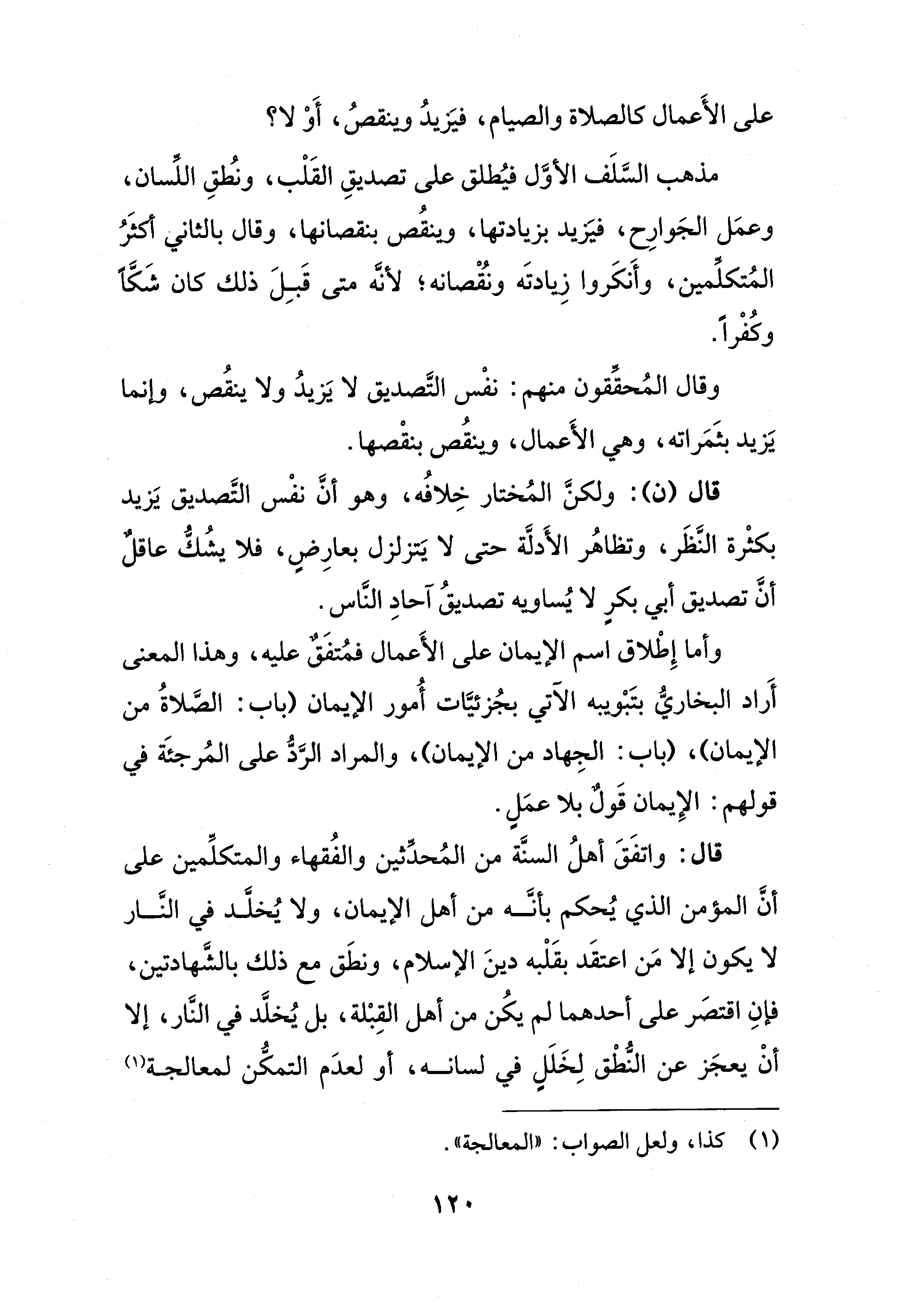 قال (ن): ولكنَّ المُختار خِلافُه، وهو أنَّ نفْس التَّصديق يَزيد بكثْرة النَّظَر، وتظاهُر الأَدلَّة حتى لا يَتزلزل بعارِضٍ، فلا يشُكُّ عاقلٌ أنَّ تصديق أبي بكرٍ لا يُساويه تصديقُ آحادِ النَّاس.