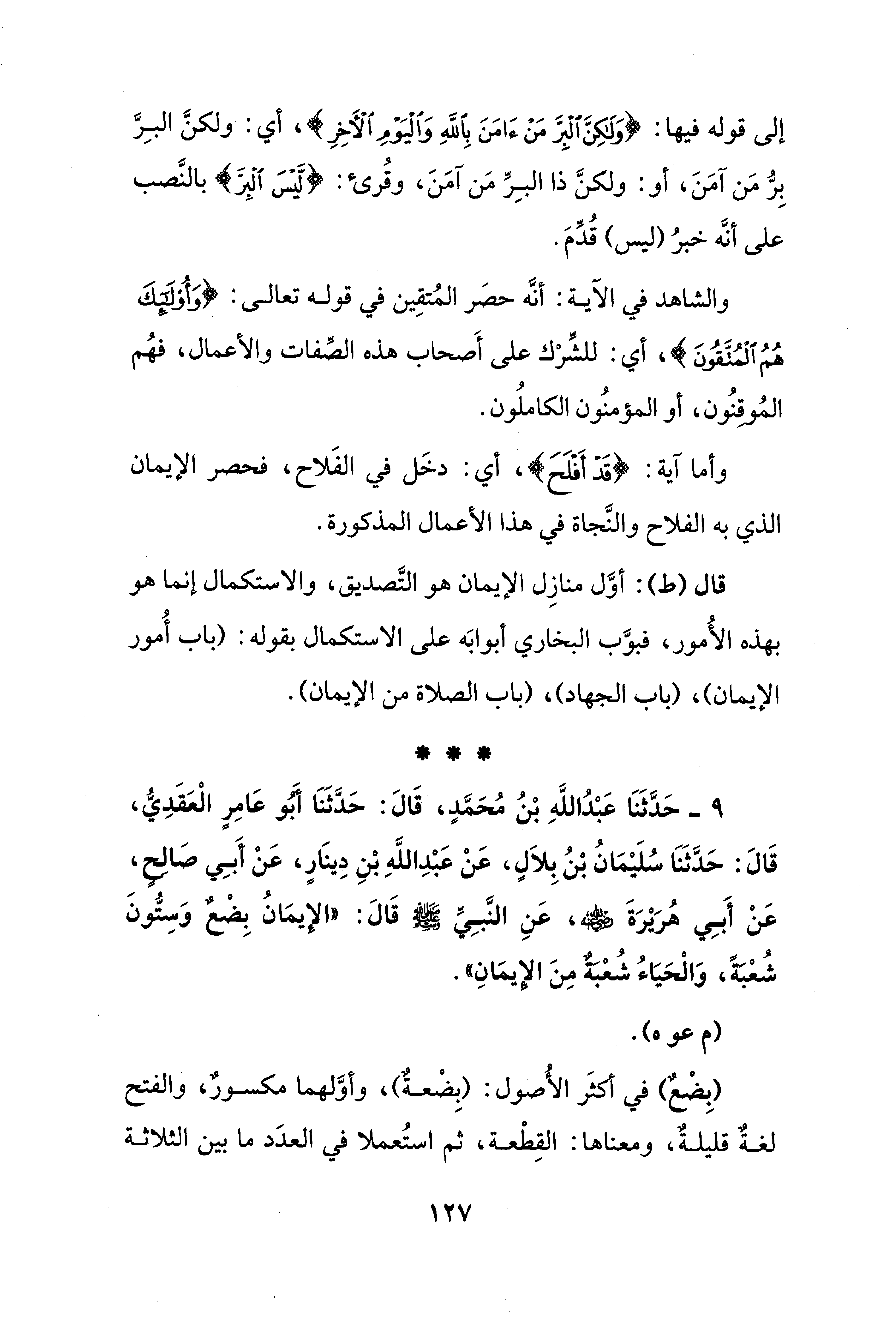 9 - حَدَّثَنَا عَبْدُ اللَّهِ بْنُ مُحَمَّدٍ، قَالَ: حَدَّثَنَا أبَو عَامِرٍ الْعَقَدِيُّ، قَالَ: حَدَّثَنَا سُلَيْمَانُ بْنُ بِلاَلٍ، عَنْ عَبْدِ اللَّهِ بْنِ دِينَارٍ، عَنْ أَبِي صَالِحٍ، عَنْ أَبِي هُرَيْرَةَ - رضي الله عنه -، عَنِ النَّبِيِّ - صلى الله عليه وسلم - قَالَ: "الإيمَانُ بِضْعٌ وَسِتُّونَ شُعْبَةً، وَالْحَيَاءُ شُعْبَةٌ مِنَ الإيمَانِ".
