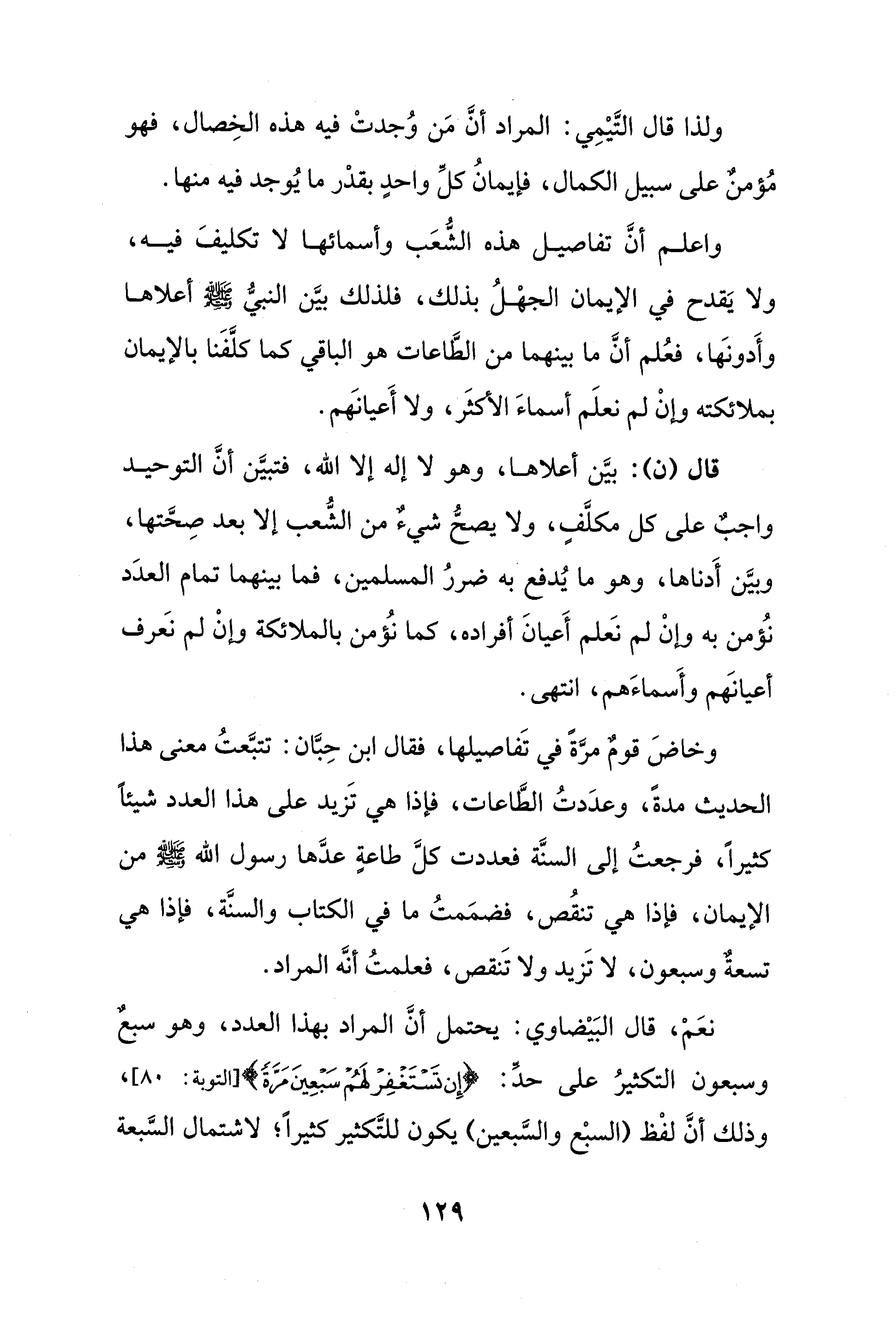 وخاضَ قومٌ مرَّةً في تَفاصيلها، فقال ابن حِبَّان: تتبَّعتُ معنى هذا الحديث مدةً، وعدَدتُ الطَّاعات، فإذا هي تَزيد على هذا العدد شيئًا كثيرًا، فرجعتُ إلى السنَّة فعددت كل طاعةٍ عدَّها رسول الله - صلى الله عليه وسلم - من الإيمان، فإذا هي تنقُص، فضمَمتُ ما في الكتاب والسنَّة، فإذا هي تسعةٌ وسبعون، لا تَزيد ولا تَنقص، فعلمتُ أنَّه المراد.