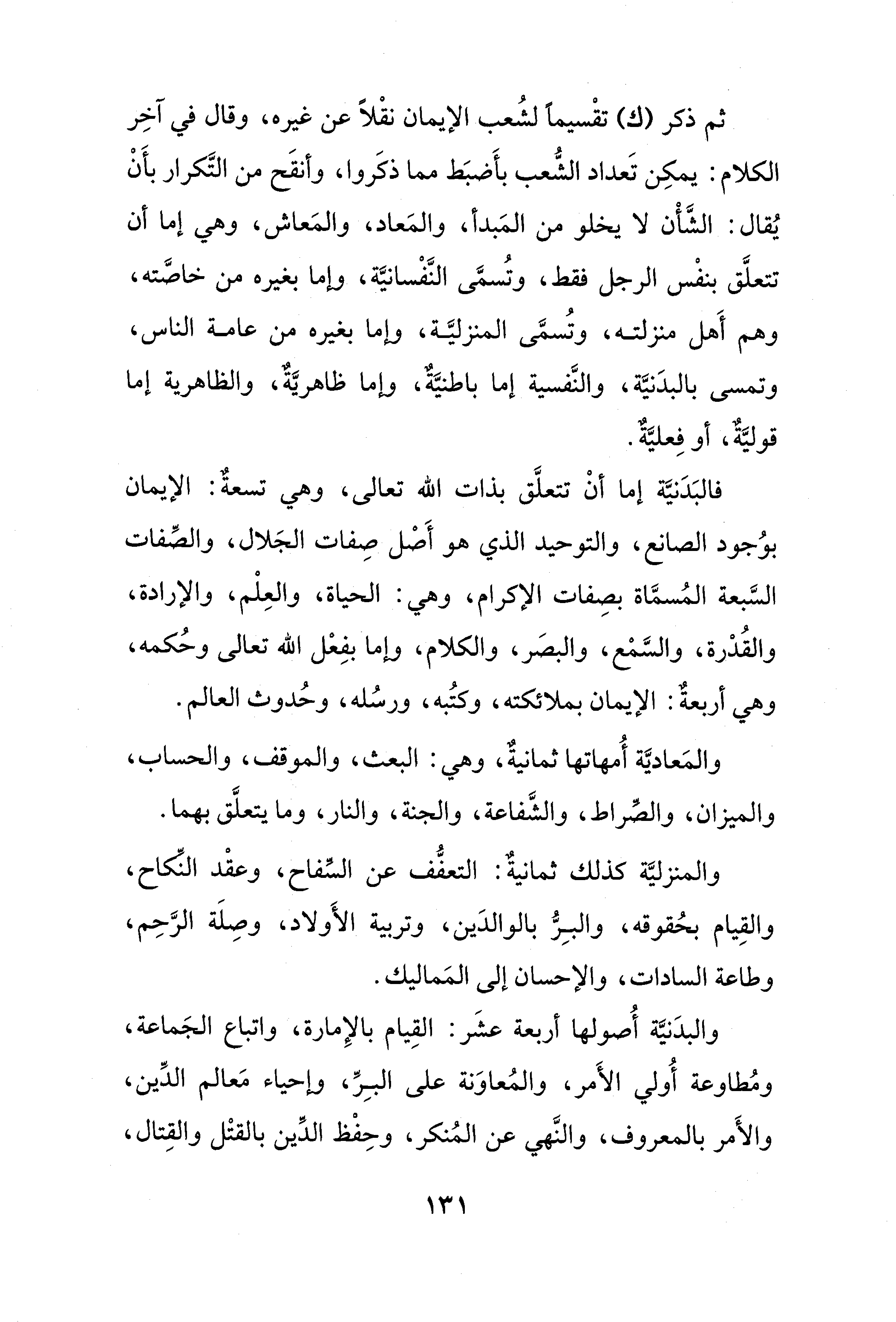 ثم ذكر (ك) تقْسيمًا لشُعب الإيمان نقْلًا عن غيره، وقال في آخِر الكلام: يمكِن تَعداد الشُّعب بأَضبَط مما ذكَروا، وأنقَح من التَّكرار بأَنْ يُقال: الشَّأْن لا يخلو من المَبدأ، والمَعاد، والمَعاش، وهي إما أن تتعلَّق بنفْس الرجل فقط، وتُسمَّى النَّفْسانيَّة، وإما بغيره من خاصَّته، وهم أَهل منزلته، وتُسمَّى المنزليَّة، وإما بغيره من عامة الناس، وتمسى بالبدَنيَّة، والنَّفسية إما باطنيَّةٌ، وإما ظاهريهةٌ، والظاهرية إما قوليَّةٌ، أو فِعليَّةٌ.