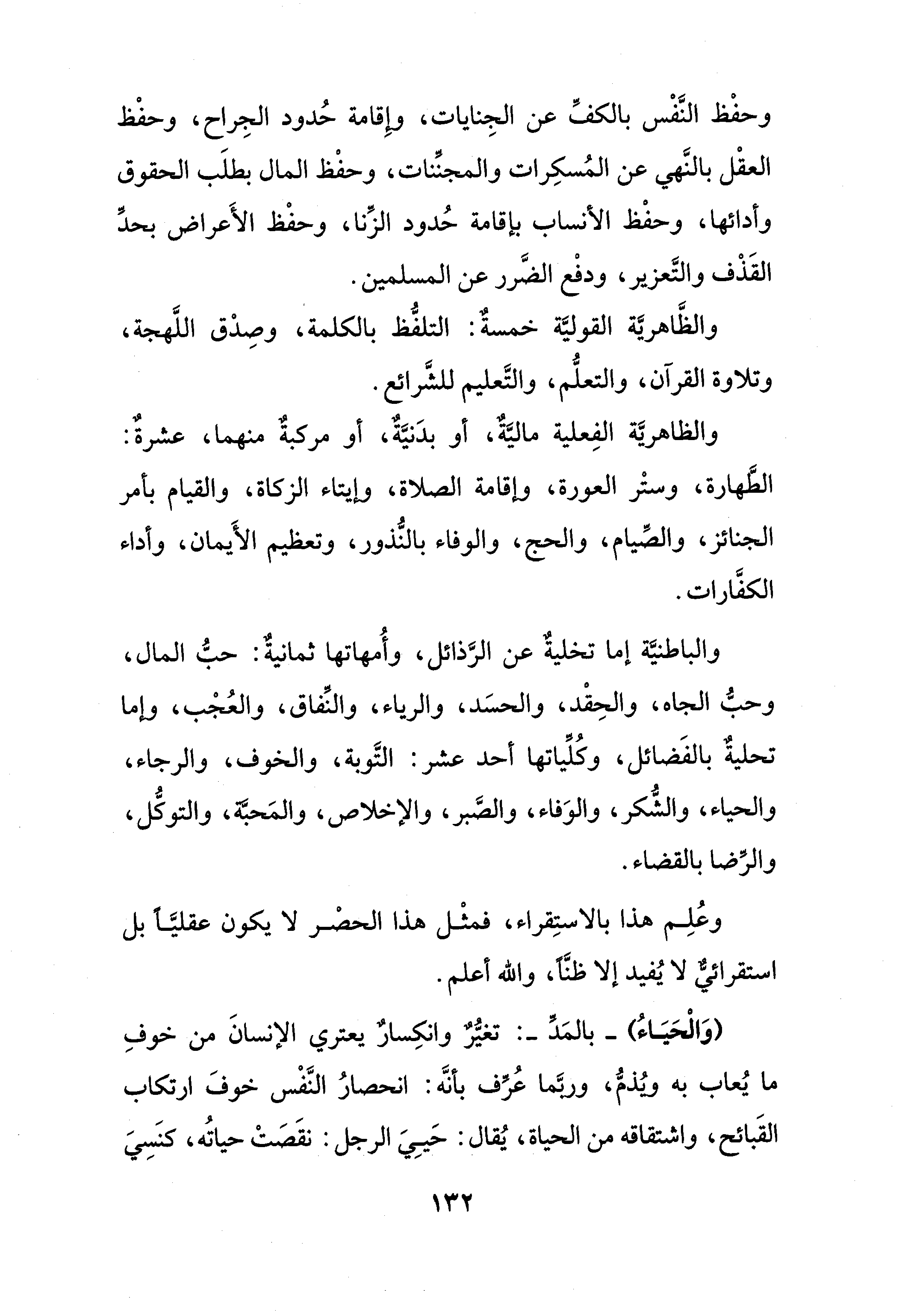 وحفْظ النَّفْس بالكفِّ عن الجِنايات، وإِقامة حُدود الجِراح، وحفْظ العقْل بالنَّهي عن المُسكِرات والمجنِّنات، وحفْظ المال بطلَب الحقوق وأدائها، وحفْظ الأنساب بإقامة حُدود الزِّنا، وحفْظ الأَعراض بحدِّ القَذْف والتَّعزير، ودفْع الضَّرر عن المسلمين.