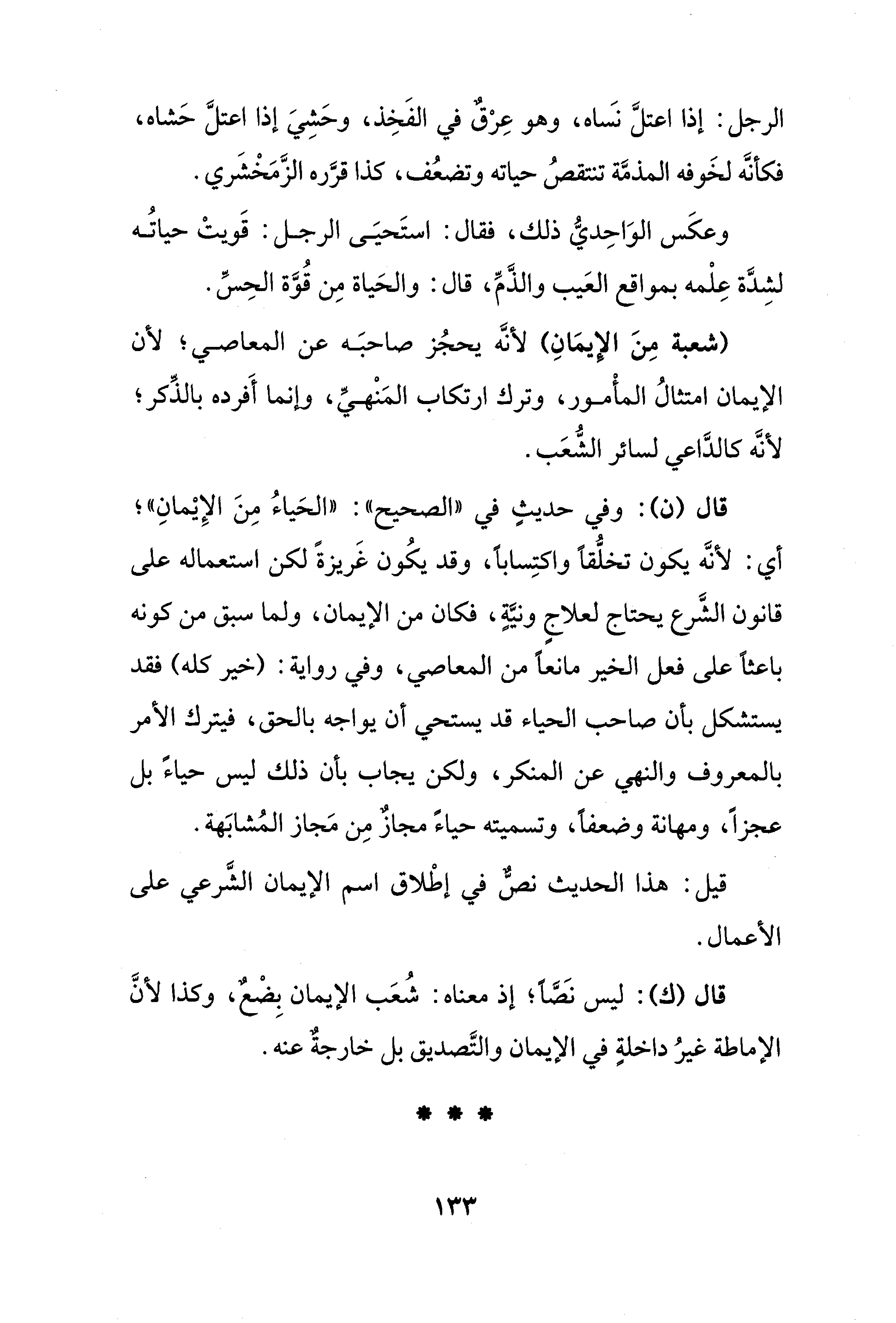 قال (ن): وفي حديثِ في "الصحيح": "الحَياءُ مِنَ الإِيْمانِ"؛ أي: لأنَّه يكون تخلُّقًا واكتِسابًا، وقد يكُون غَريزةً لكن استعماله على قانون الشَّرع يحتاج لعلاجٍ ونيَّةِ، فكان من الإيمان، ولما سبق من كونه باعثًا على فعل الخير مانعًا من المعاصي، وفي رواية: (خير كله) فقد يستشكل بأن صاحب الحياء قد يستحي أن يواجه بالحق، فيترك الأمر بالمعروف والنهي عن المنكر، ولكن يجاب بأن ذلك ليس حياءً بل عجزًا، ومهانة وضعفًا، وتسميته حياءً مجاز مِن مَجاز المُشابَهة.