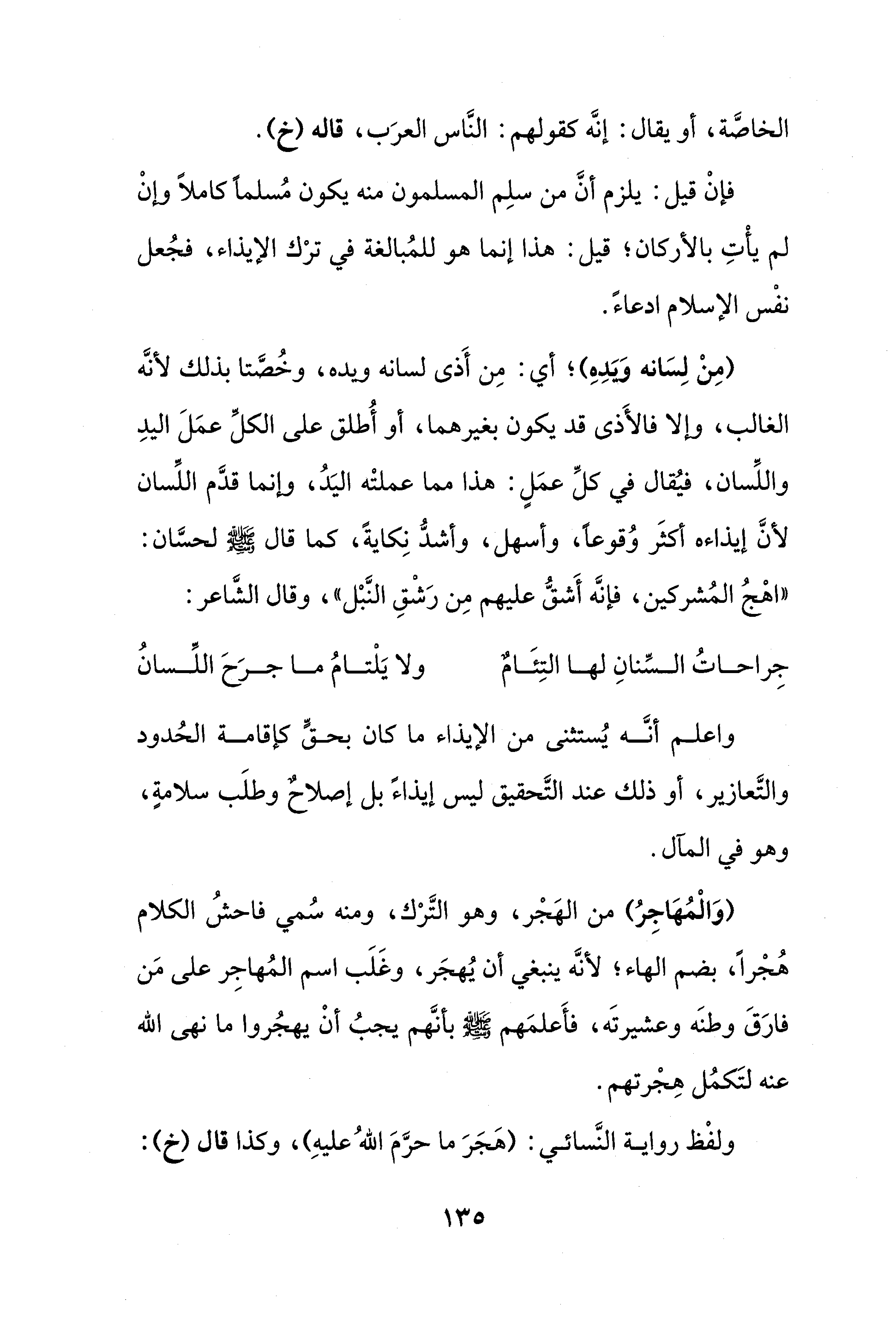 (وَالْمُهَاجِرُ) من الهَجْر، وهو التَّرْك، ومنه سُمي فاحشُ الكلام هُجْرًا، بضم الهاء؛ لأنَّه ينبغي أن يُهجَر، وغَلَب اسم المُهاجِر على مَن فارَقَ وطنَه وعشيرتَه، فأَعلمَهم - صلى الله عليه وسلم - بأنَّهم يجبُ أنْ يهجُروا ما نهى الله عنه لتَكمُل هِجْرتهم.