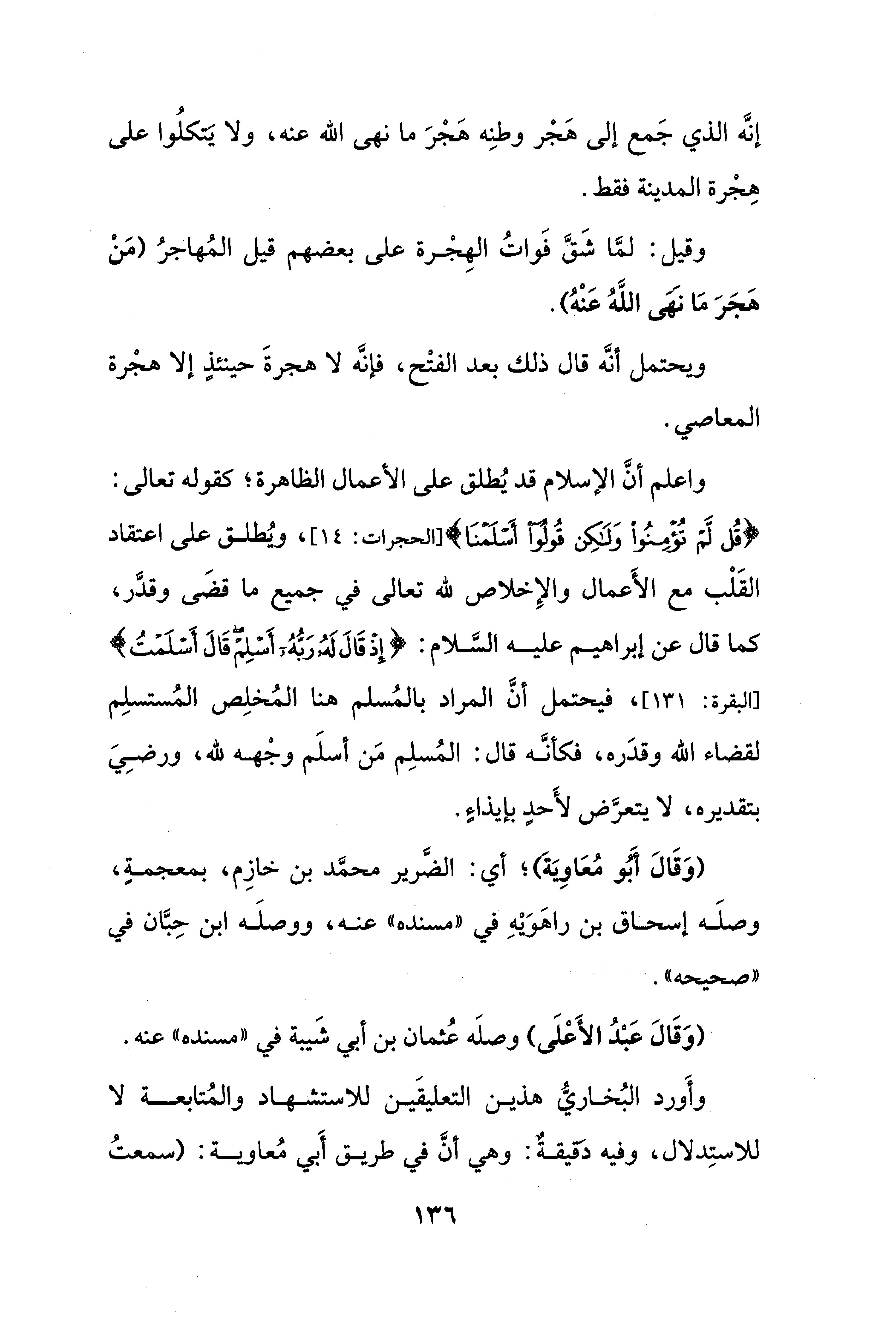 واعلم أنَّ الإسلام قد يُطلق على الأعمال الظاهرة؛ كقوله تعالى: {قُلْ لَمْ تُؤْمِنُوا وَلَكِنْ قُولُوا أَسْلَمْنَا} [الحجرات: 14]، ويُطلق على اعتقاد القَلْب مع الأَعمال والإِخلاص لله تعالى في جميع ما قضَى وقدَّر، كما قال عن إبراهيم عليه السَّلام: {إِذْ قَالَ لَهُ رَبُّهُ أَسْلِمْ قَالَ أَسْلَمْتُ} [البقرة: 131]، فيحتمل أنَّ المراد بالمُسلم هنا المُخلِص المُستسلِم لقضاء الله وقدَره، فكأنَّه قال: المُسلِم مَن أسلَم وجْهه لله، ورضِيَ بتقديره، لا يتعرَّض لأَحدٍ بإيذاءٍ.