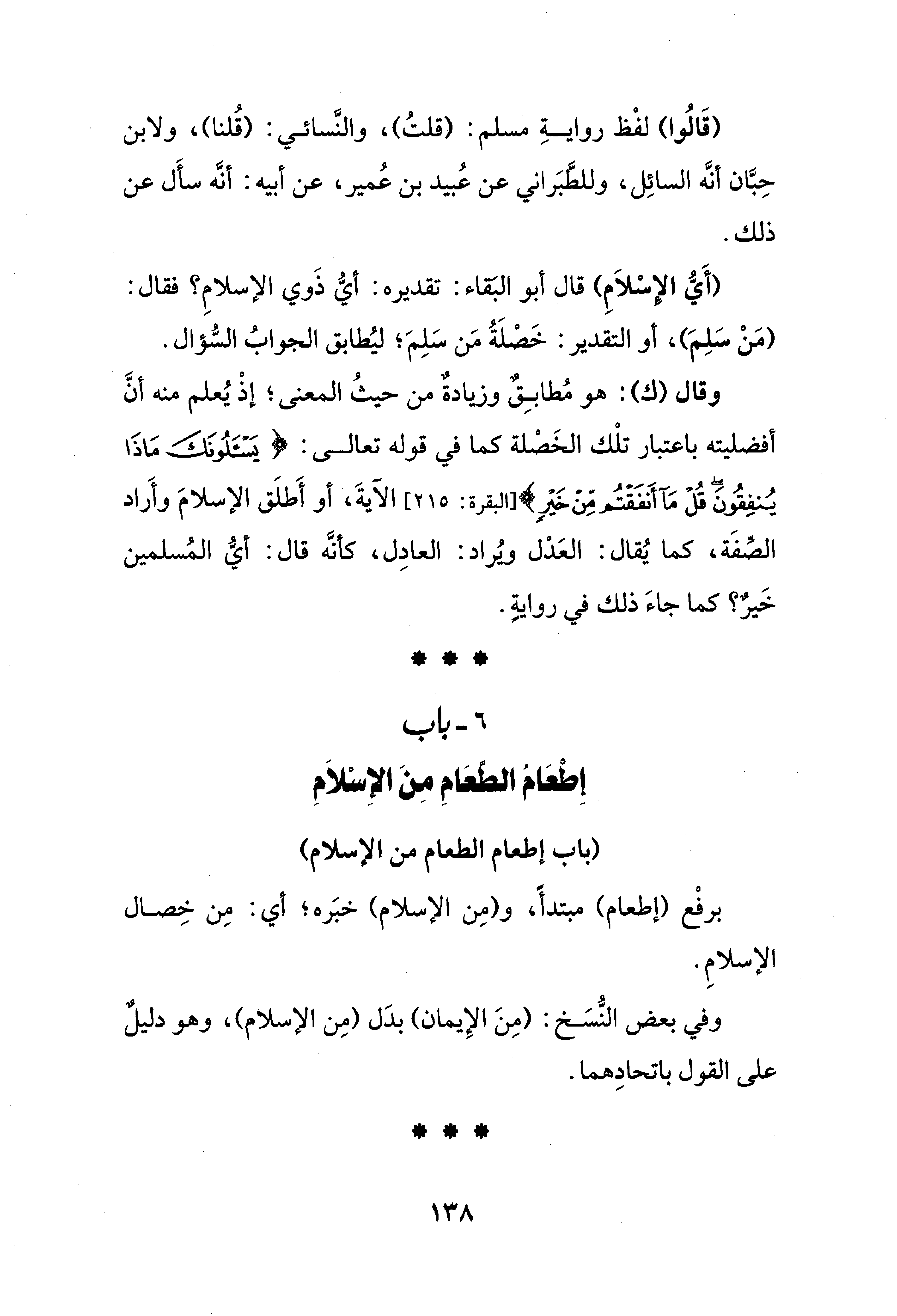 وقال (ك): هو مُطابِقٌ وزيادةٌ من حيثُ المعنى؛ إذْ يُعلم منه أنَّ أفضليته باعتبار تلْك الخَصْلة كما في قوله تعالى: {يَسْأَلُونَكَ مَاذَا يُنْفِقُونَ قُلْ مَا أَنْفَقْتُمْ مِنْ خَيْرٍ} [البقرة: 215] الآيةَ، أو أطلق الإسلامَ وأراد الصِّفَة، كما يُقال: العَدْل وُيراد: العادِل، كأنَّه قال: أيُّ المُسلمين خَيرٌ؟ كما جاءَ ذلك في روايةٍ.