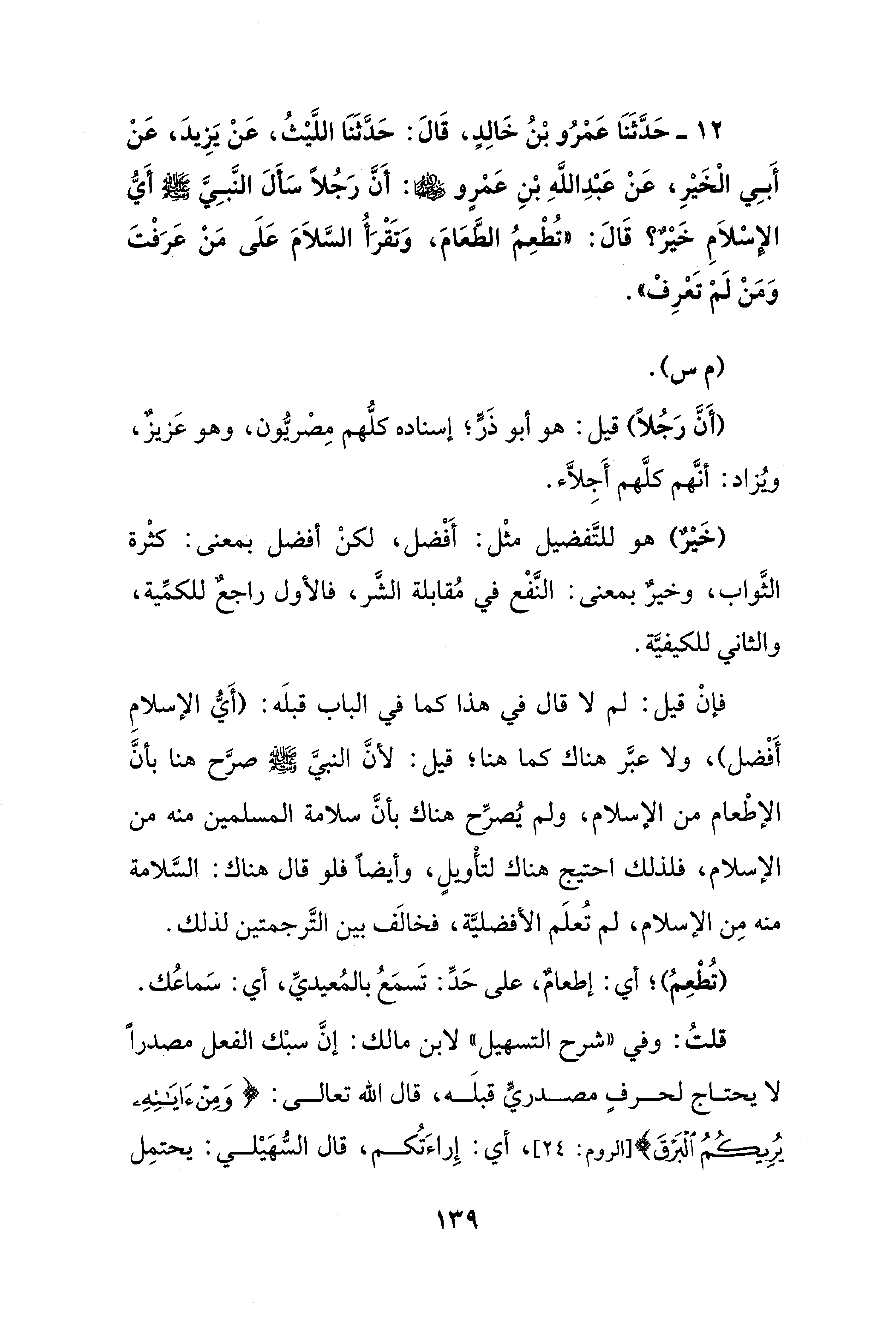12 - حَدَّثَنَا عَمْرُو بْنُ خَالِدٍ، قَالَ: حَدَّثَنَا اللَّيْثُ، عَنْ يَزِيدَ، عَنْ أَبِي الْخَيْرِ، عَنْ عَبْدِ اللَّهِ بْنِ عَمْرٍو: أَنَّ رَجُلًا سَأَلَ النَّبِيَّ صلى الله عليه وسلم أَيُّ الإسْلاَمِ خَيْرٌ؟ قَالَ: "تُطْعِمُ الطَّعَامَ، وَتَقْرَأُ السَّلاَمَ عَلَى مَنْ عَرَفْتَ وَمَنْ لَمْ تَعْرِفْ".