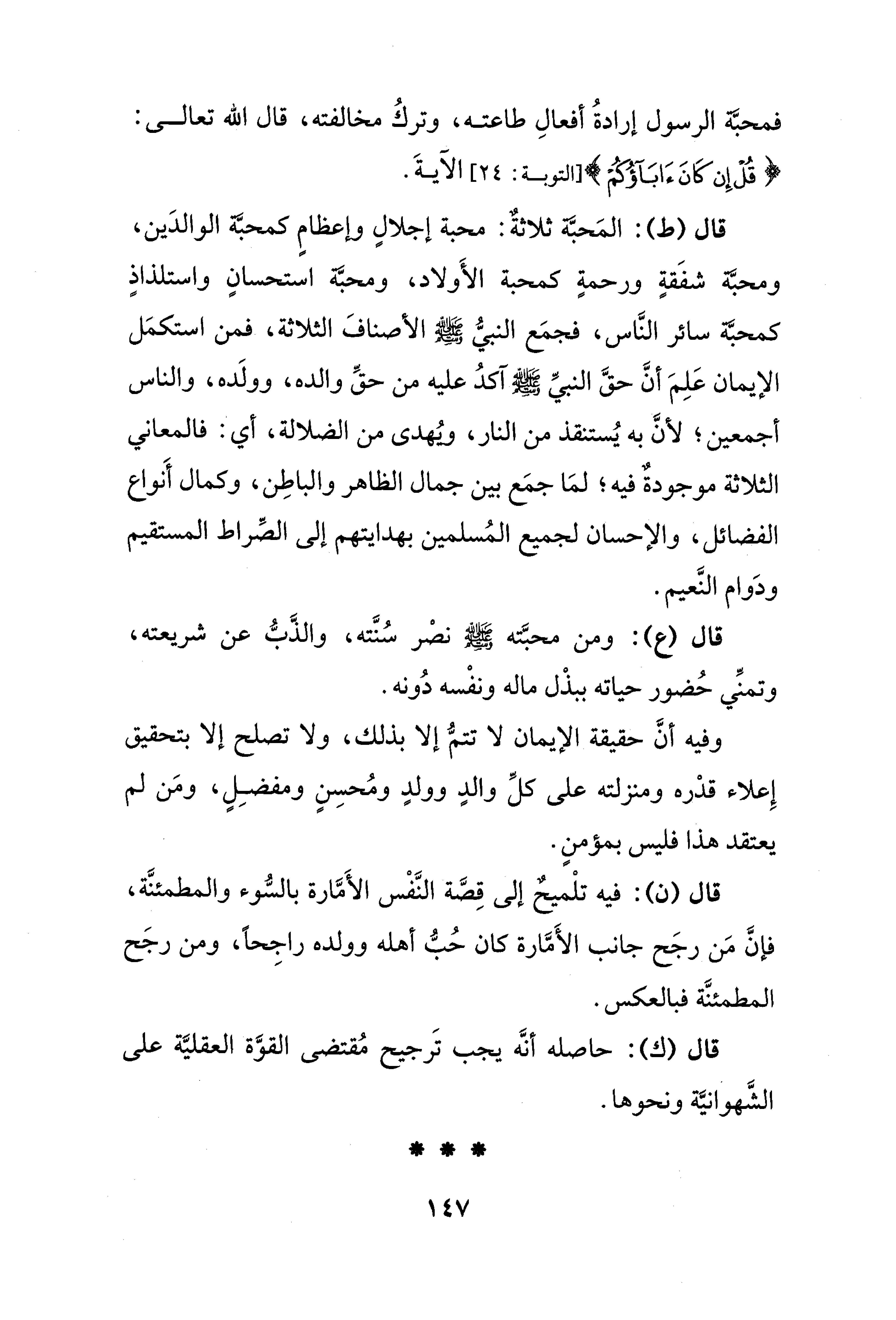 وفيه أنَّ حقيقة الإيمان لا تتمُّ إلا بذلك، ولا تصلح إلا بتحقيق إِعلاء قدْره ومنزلته على كلِّ والدٍ وولدٍ ومُحسِنٍ ومفضِل، ومَن لم يعتقد هذا فليس بمؤمنٍ.
