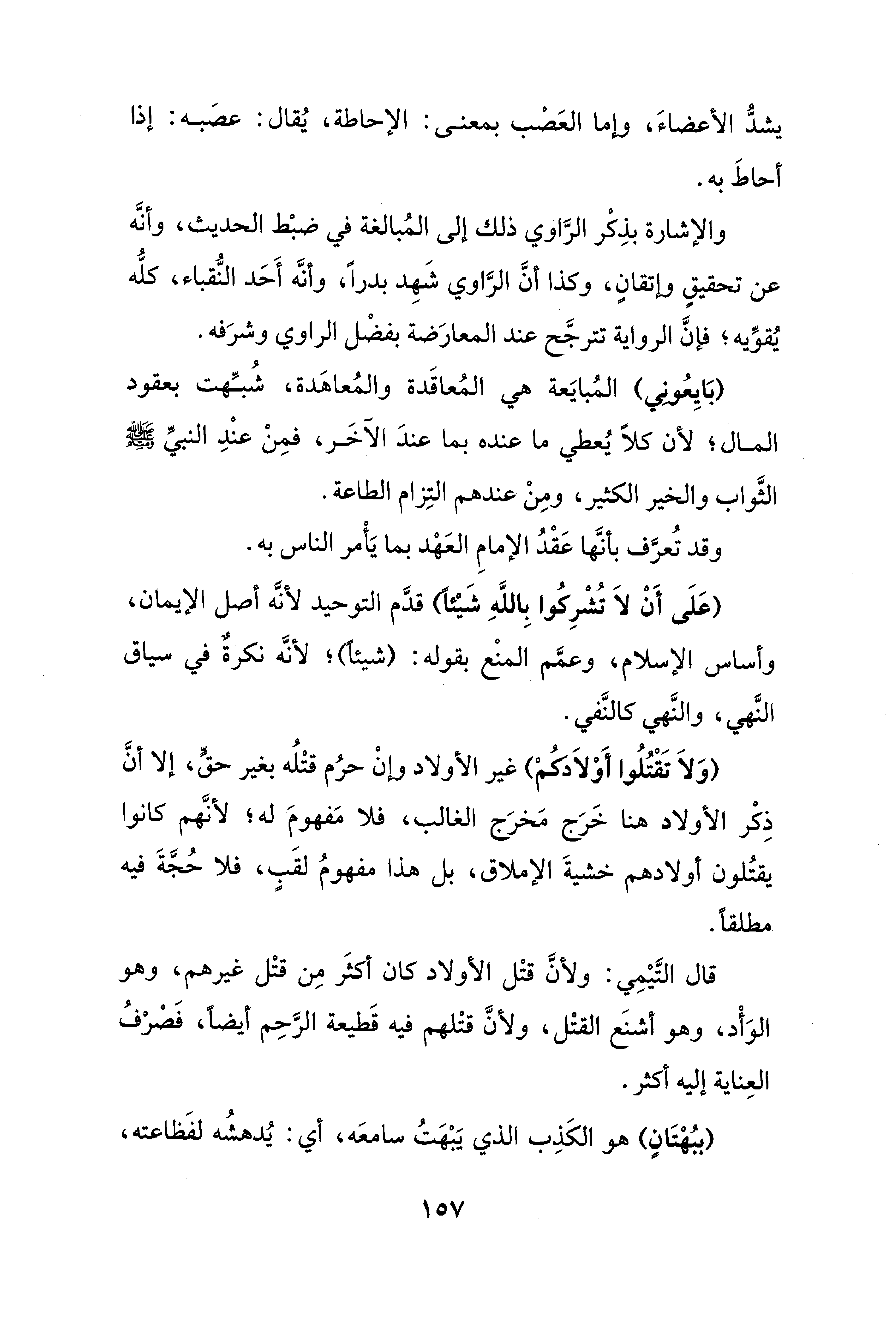 (عَلَى أَنْ لاَ تُشْرِكُوا بِاللَّهِ شَيْئًا) قدَّم التوحيد لأنَّه أصل الإيمان، وأساس الإسلام، وعمَّم المنْع بقوله: (شيئًا)؛ لأنَّه نكرةٌ في سياق النَّهي، والنَّهي كالنَّفي.