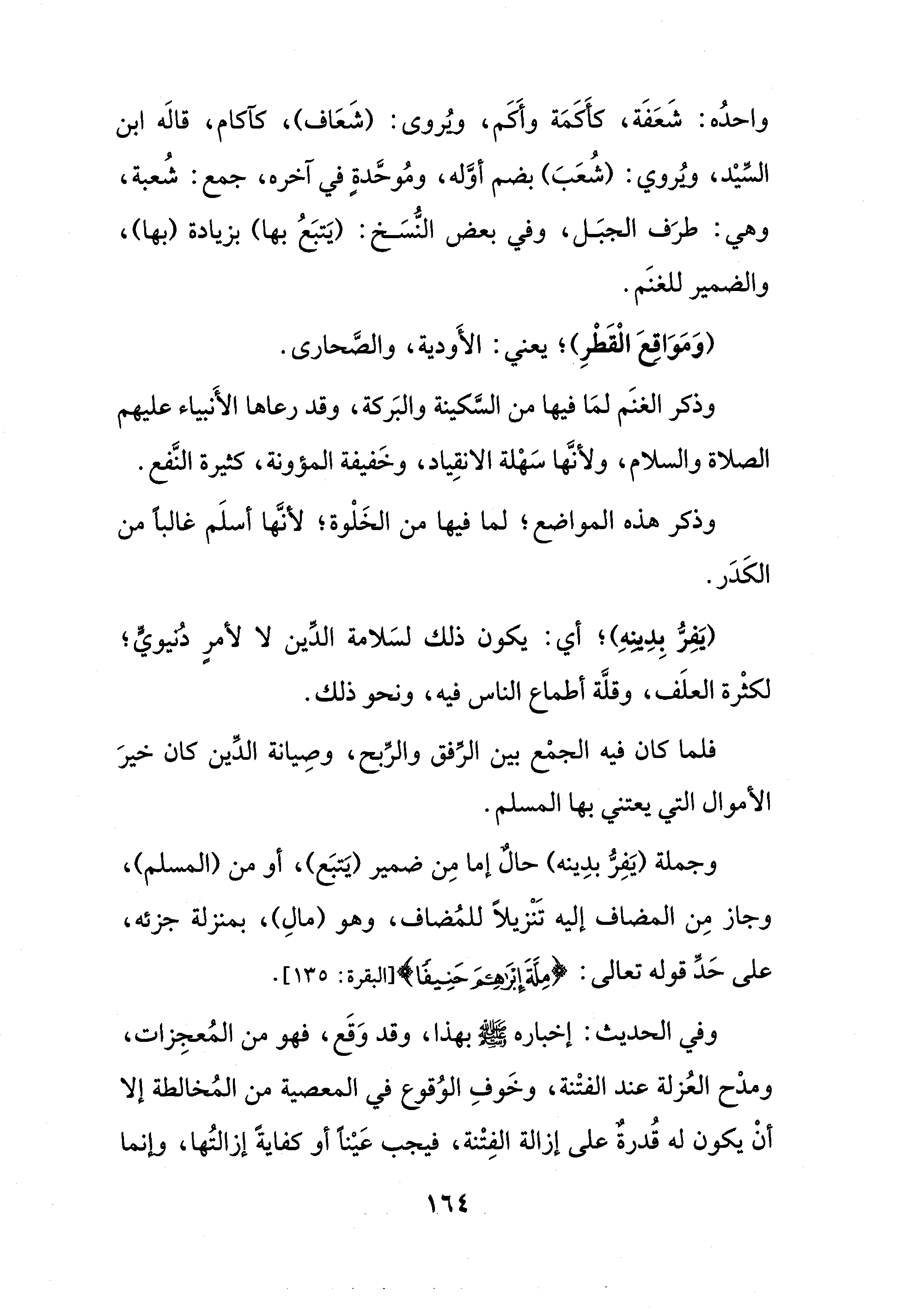 وجملة (يَفِرُّ بدِينه) حالٌ إما مِن ضمير (يَتبَع)، أو من (المسلم)، وجاز مِن المضاف إليه تَنْزيلًا للمُضاف، وهو (مالِ)، بمنزلة جزئه، على حَدِّ قوله تعالى: (مِلَّةَ إبرَاهِيمَ حَنِيفًا} [البقرة: 135].