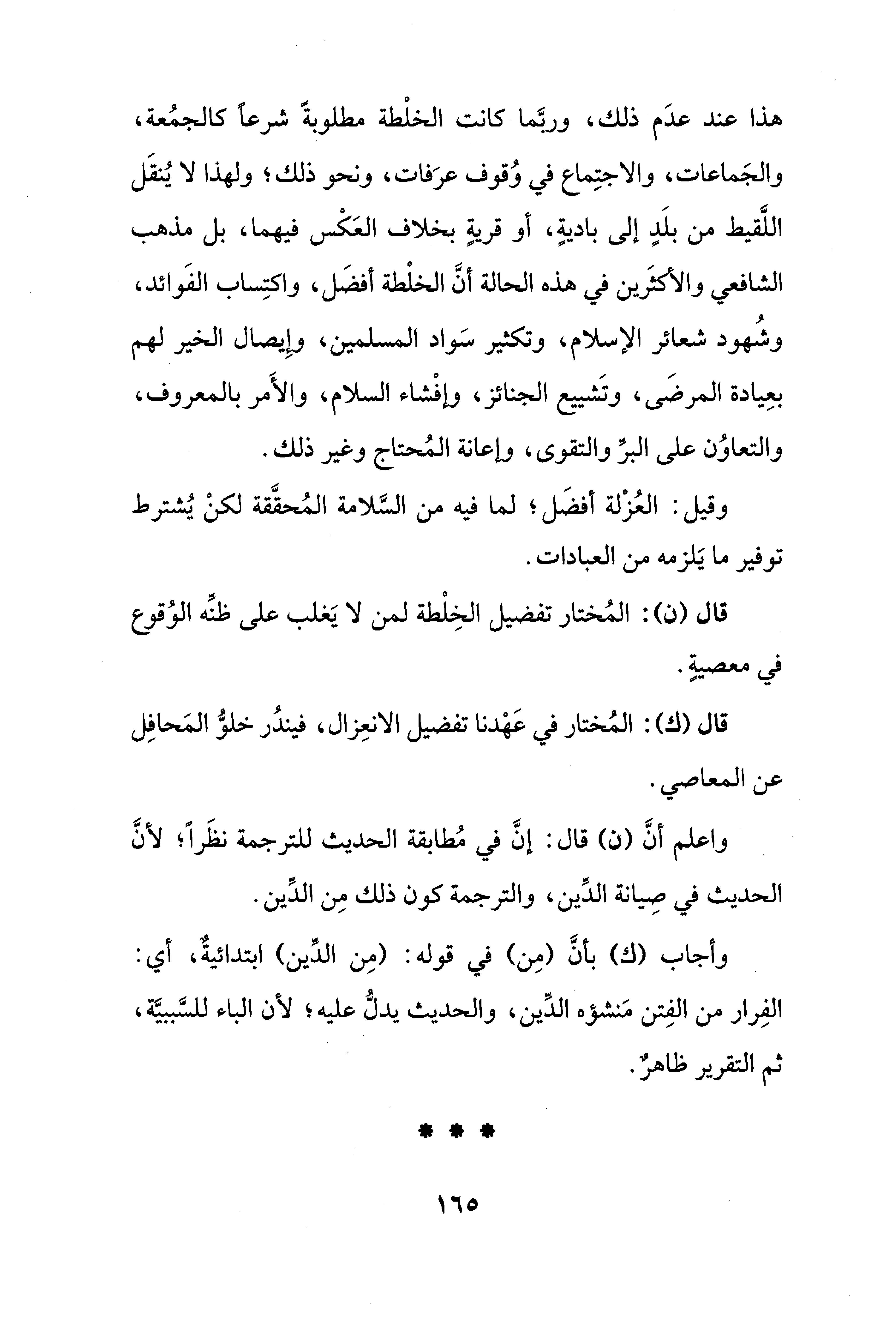 قال (ن): المُختار تفضيل الخِلْطة لمن لا يَغلب على ظنِّه الوُقوع في معصيةٍ.