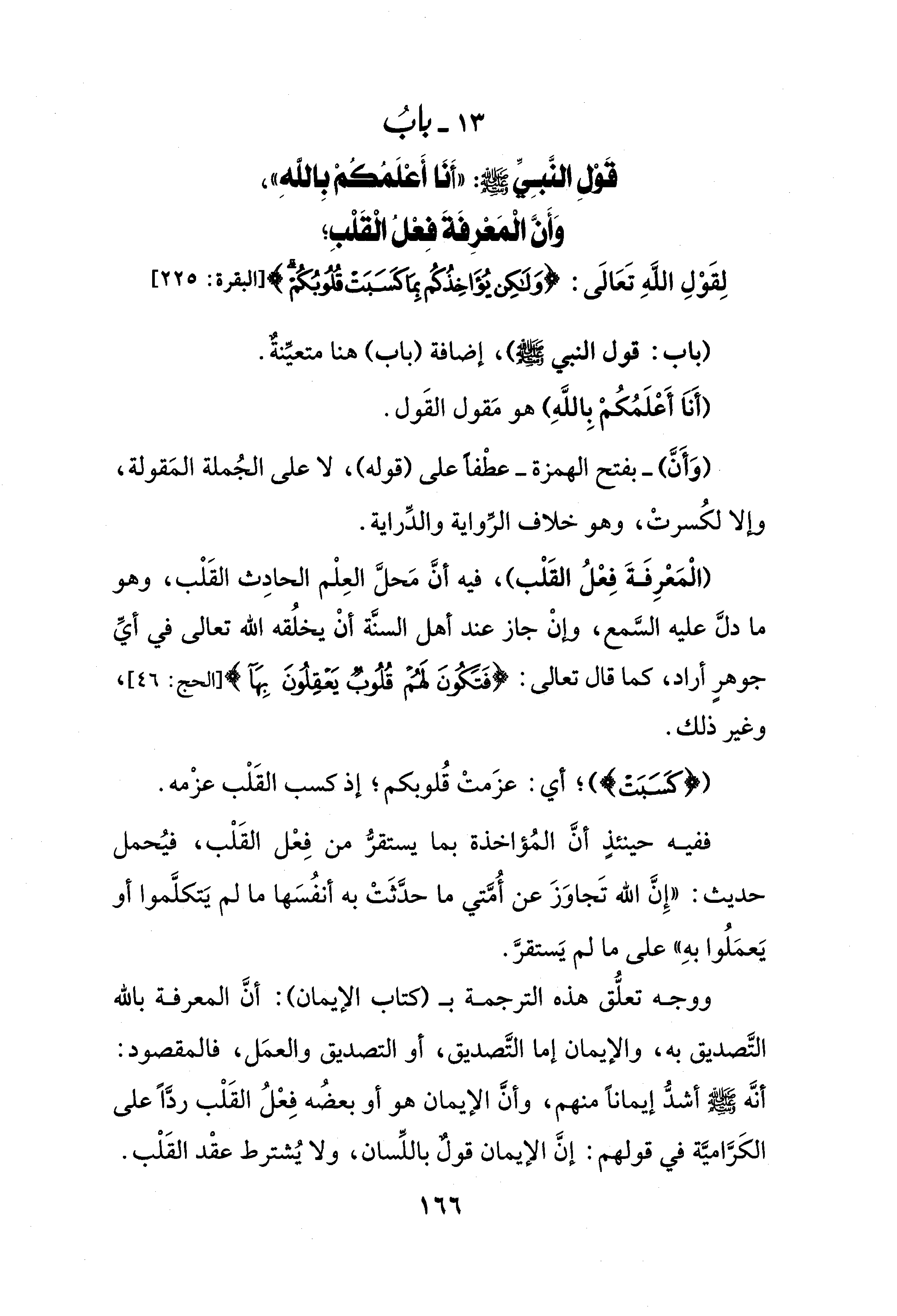 13 - بابُ قَوْلِ النَّبِيِّ صلى الله عليه وسلم: "أَنَا أَعْلَمُكُمْ بِاللهِ"، وَأَنَّ الْمَعْرِفَةَ فِعْلُ الْقَلْبِ؛ لِقَوْلِ اللهِ تَعَالَى: {وَلَكِنْ يُؤَاخِذُكُمْ بِمَا كَسَبَتْ قُلُوبُكُمْ} [البقرة: 225]